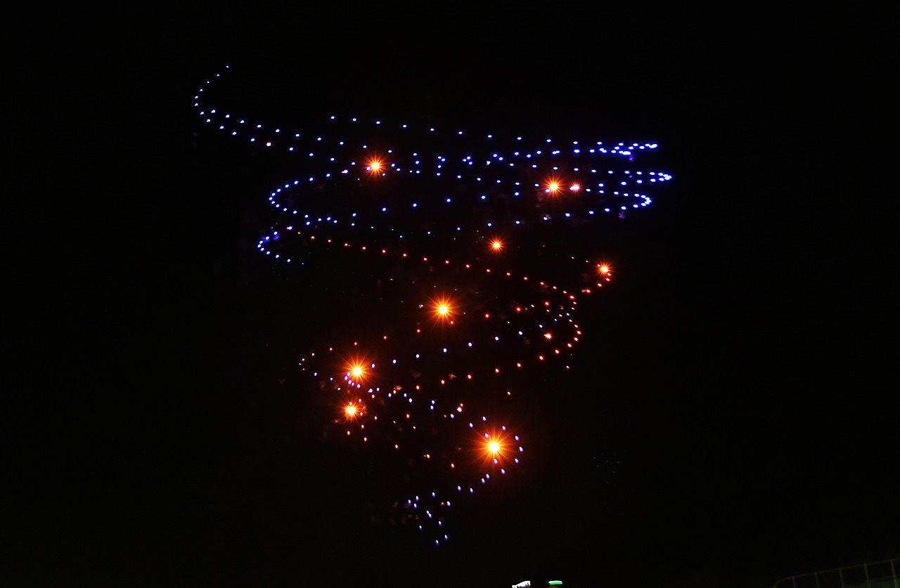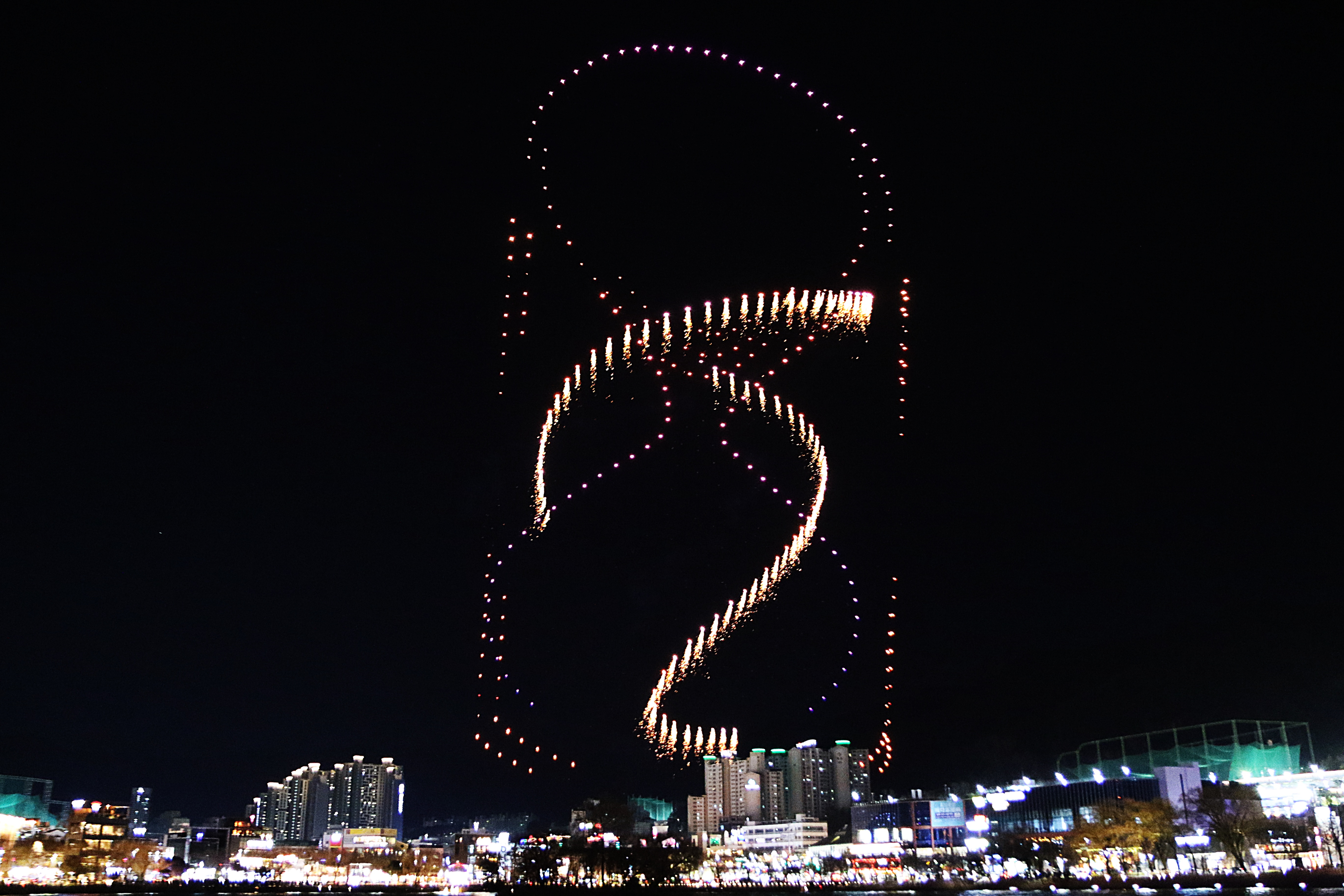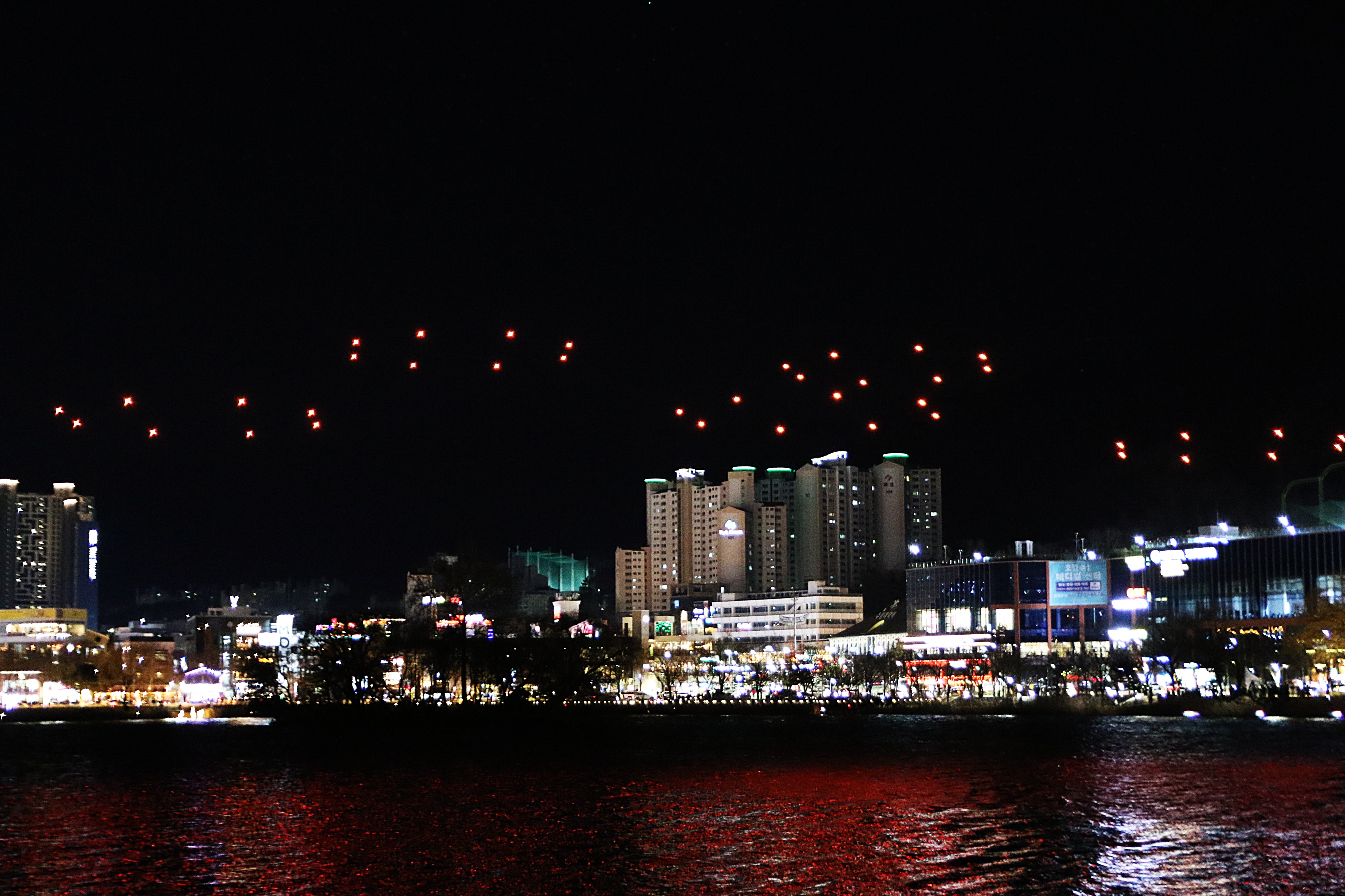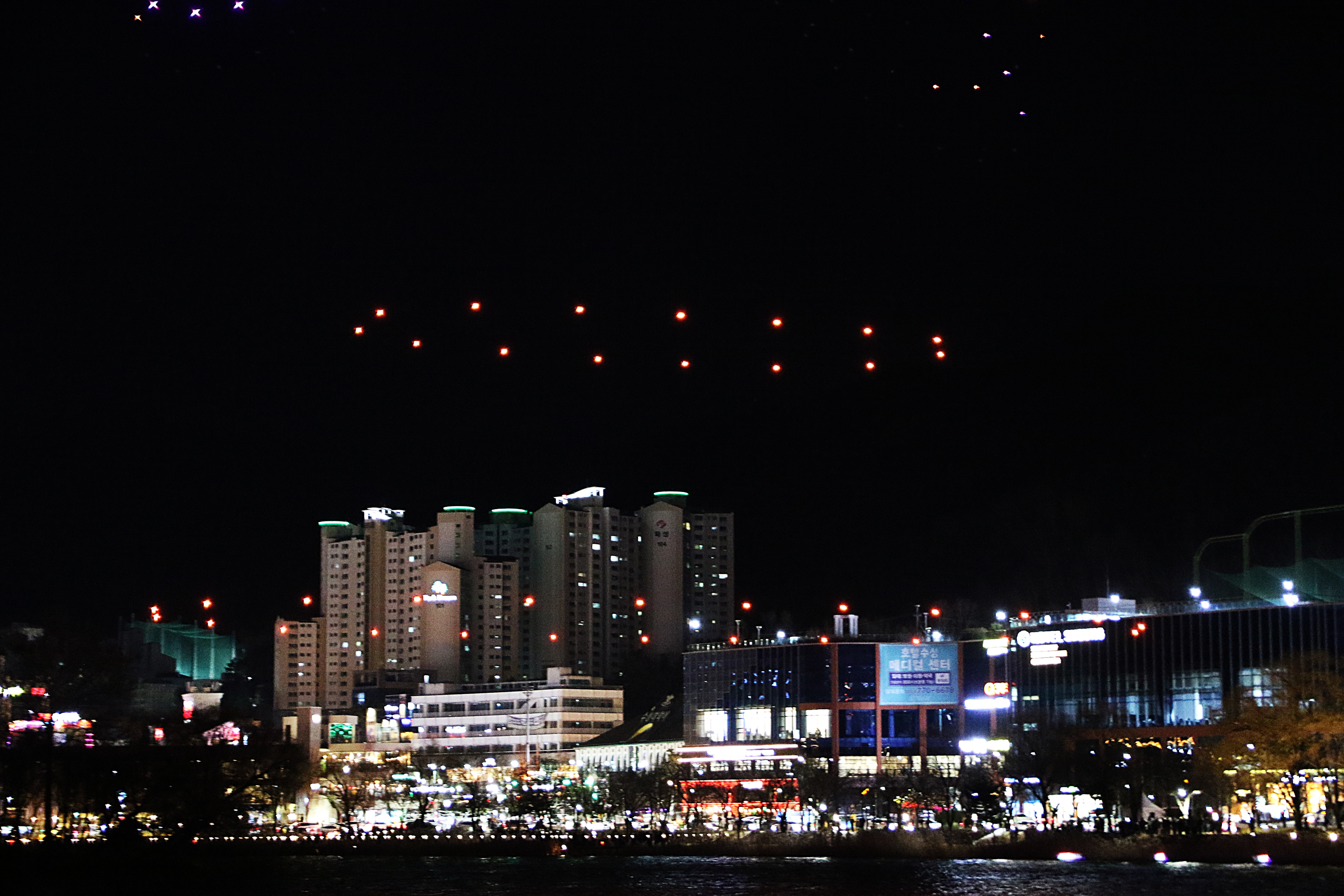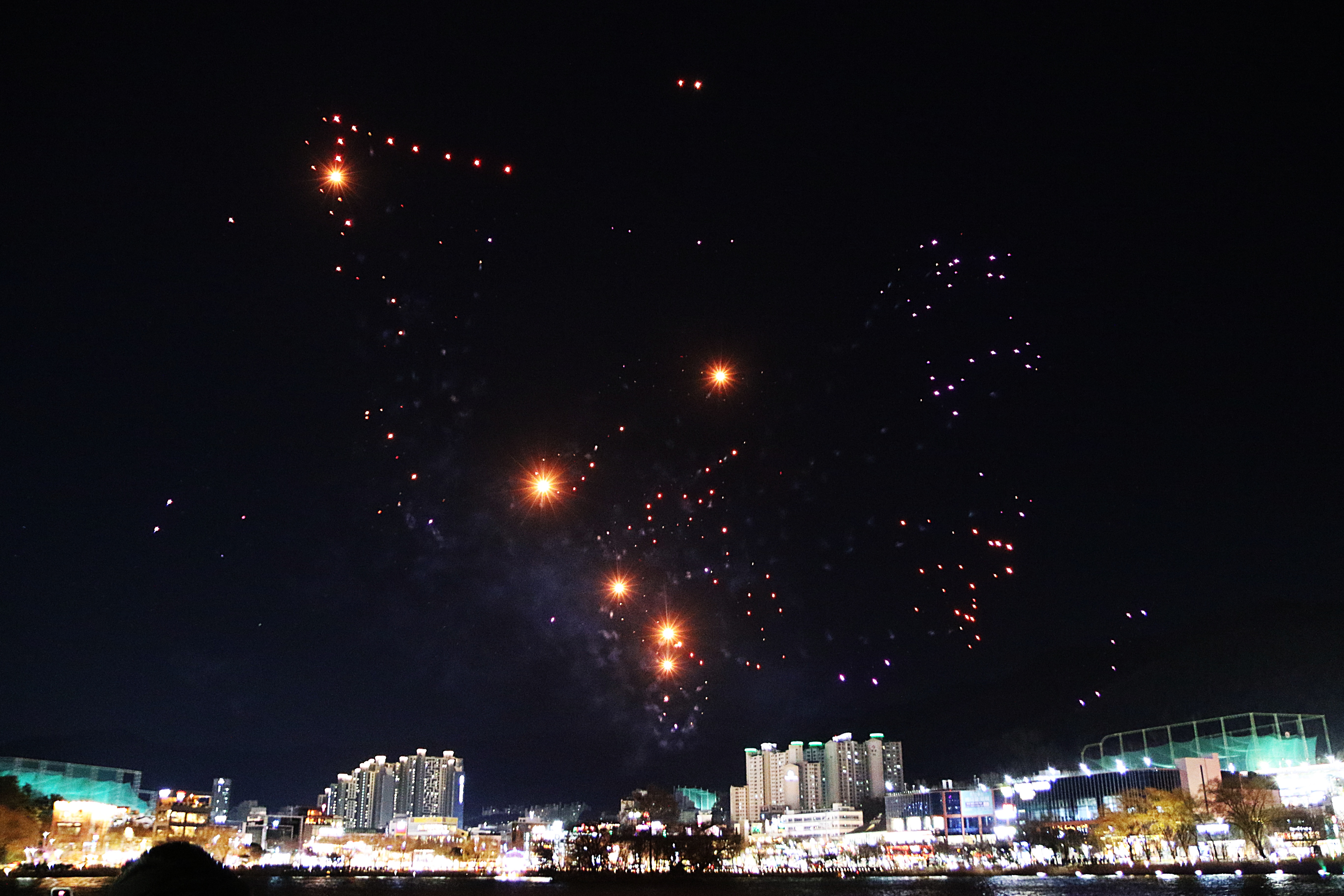 수많은 시민들이 몰려 하늘에서 펼쳐지는 환상의 불빛을 감상한다.