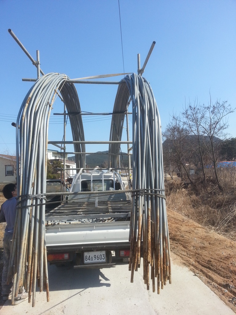 지난 가을 중고 하우스 파이프를 뽑아 놓고 아래사진처럼 트럭에 틀 만들어 파이프 운반해 놨었죠.