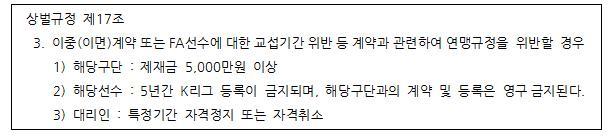 ② 신인선수선발 시 계약 위반에 대한 제재는 상벌규정 제17조 3항에 의한다.