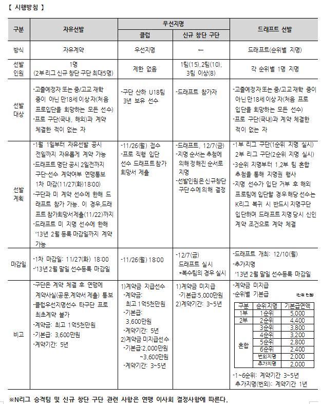 【 선발방식 】 1. 프로팀 최초 입단 선수의 선발 방식은 자유선발, 우선지명, 드래프트 방식으로 선발한다. 2. 신인선수선발은 시행방침에 따라 연맹에서 정한 날짜에 실시한다. 3. 드래프트 지명은 1부 리그 구단이 1순위 지명, 2부 리그 구단이 2순위 지명을 실시하고, 각 순위 별 지명 순서는 추첨에 의해 정해진 순서로 지명한다. 3순위 지명부터는 1부, 2부 팀 혼합 추첨에 의해 정해진 순서대로 지명한다.