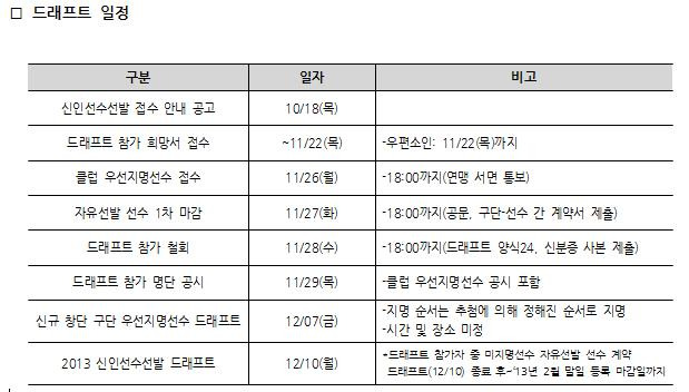 ① 드래프트 참가를 희망하는 모든 선수는 드래프트 참가 희망서[양식.21]를 작성하여 2012년 11월 22일 (목)까지 구비서류와 함께 연맹에 제출해야 한다. (우편접수, 11월 22일(목) 소인까지 유효)