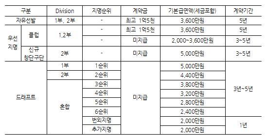 【 신인선수 선발제도 】 1. 자유선발, 우선지명, 드래프트 1) 2013년부터 입단하는 모든 신인선수를 대상으로 적용한다. 2) 연봉 ① 연봉은 기본급연액과 수당(출전급, 승리급, 출전승리급)을 모두 합한 것으로 계약서상에 반드시 기재 하여야 하며, 명시된 내용만을 인정한다. ② 수당은 구단과 선수간의 합의에 따라 자율적으로 정할 수 있다. ③ 연봉은 계약기간에 따라 매년 또는 다년계약이 가능하다. ④ 프로 최초 계약에 따른 계약기간 동안 매년 기본급연액을 조정할 수 있다. 조정금액은 전년도 기본급 연액의 100%를 초과할 수 없으며, 최저 기본급연액은 2,000만원으로 한다. 3) 계약기간 및 기본급연액은 다음과 같다.