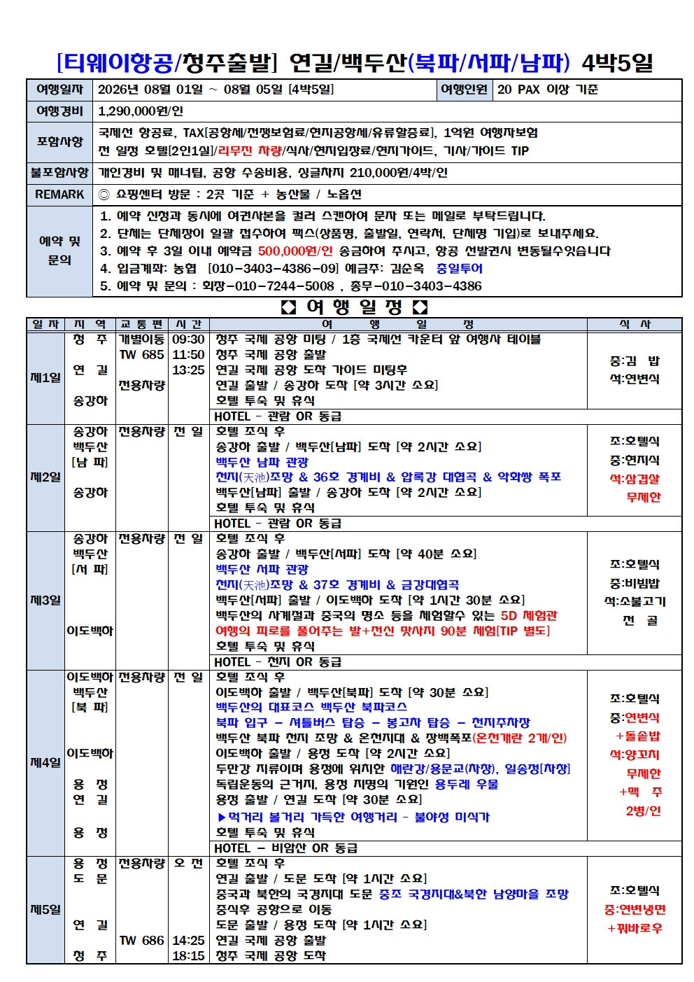 [청주출발/]여름휴가 {2026년 08월 1일~5일} 출발/남파+북파+서파백두산 3회등정 4박5일 출발안내 작성자풍산ㆍ소녀|작성시간26.03.16|조회수381 목록 댓글 5 글자크기 작게가 글자크기 크게가 다음검색 현재 게시글 추가 기능 열기 북마크 공유하기 신고 센터로 신고 댓글 댓글 5 댓글쓰기 답글쓰기 댓글 리스트 작성자풍산ㆍ소녀 작성자 본인 여부 작성자 | 작성시간 26.03.16 천태산 님 5명 신청 하셨습니다,,,,,,,,,,,,,,,, 작성자풍산. | 작성시간 26.03.23 선화공주 님 8명 신청 하셨습니다 해당 댓글은 작성자와 운영진만 볼 수 있습니다. 작성자풍산ㆍ소녀 작성자 본인 여부 작성자 | 작성시간 26.03.24 new 2명 신청하셨습니다 해당 댓글은 작성자와 운영진만 볼 수 있습니다. 댓글 전체보기