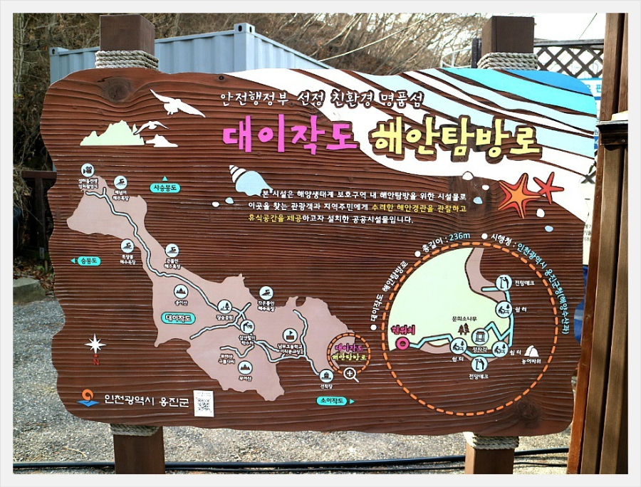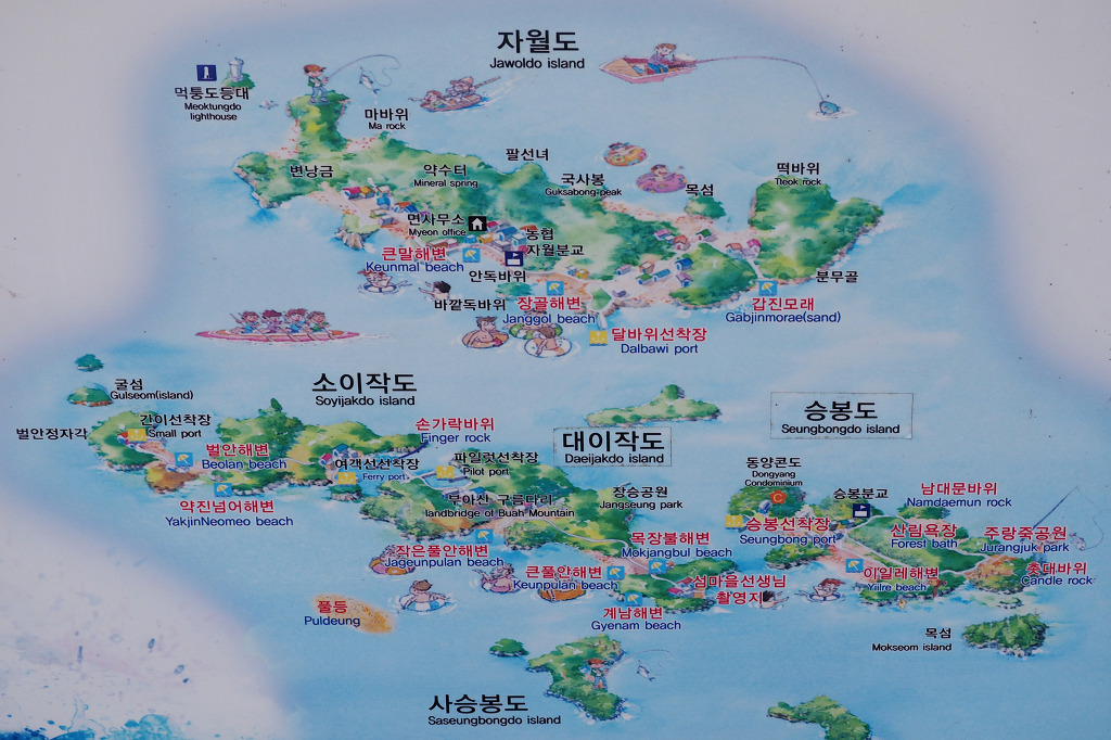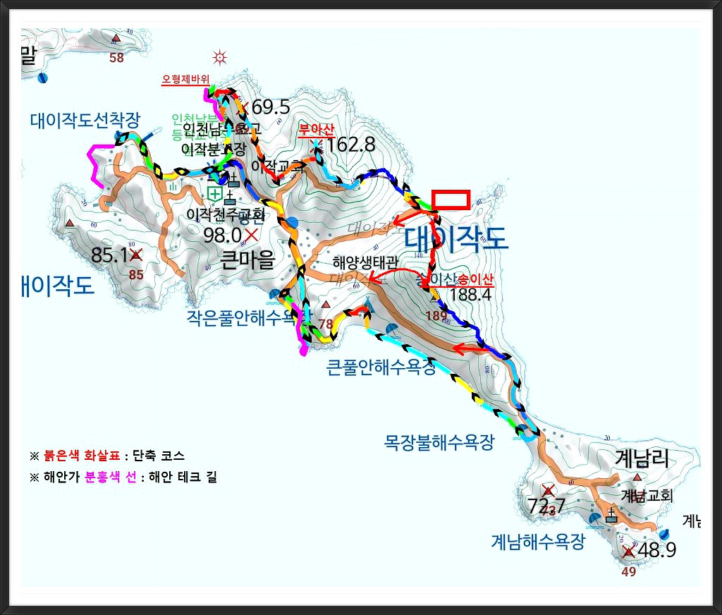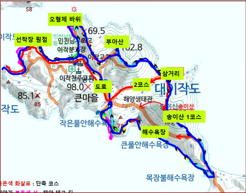 | 코스 | A코스:대이작도선착장→오형제바위→부아산정상(159m)→송이산정상(188.5m) 목장불→계남마을(섬마을선생촬영지)→큰풀안해수욕장→작은풀안해수욕장→장승공원 삼신할미약수터→큰마을→대이작도선착장(약12Km) 약4시간30분 B코스:대이작도선착장→오형제바위→부아산정상→장승공원→삼신할미약수터→큰마을 대이작도선착장 약2시간30분 2코스 소이작도 선착장-손가락바워-봉우재-큰산-벌안해변-목섬 -선착장원점-{10km3시간30분트레킹 } |