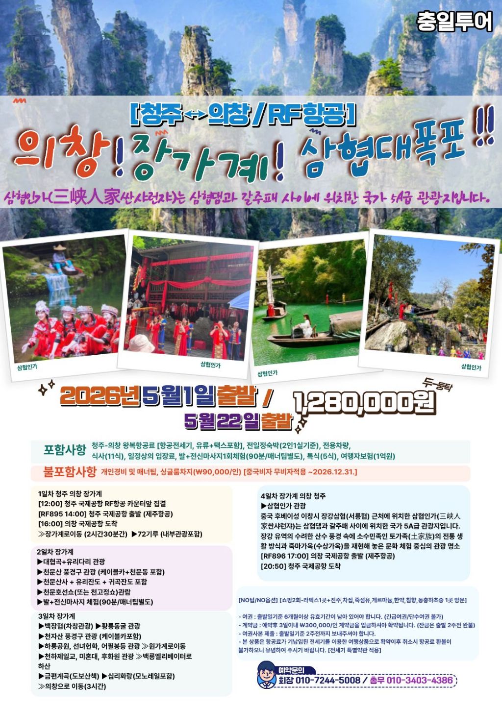 (특가 황금연휴 2026년 5월 1일 =4일. 의창 장가계 삼협대폭포 3박4일 안내 작성자풍산ㆍ소녀|작성시간26.03.05|조회수271 목록 댓글 2 글자크기 작게가 글자크기 크게가 다음검색 현재 게시글 추가 기능 열기 북마크 공유하기 신고 센터로 신고 댓글 댓글 2 댓글쓰기 답글쓰기 댓글 리스트 작성자파워맨 | 작성시간 26.03.15 청사 2명 신청합니다. 답댓글 작성자풍산ㆍ소녀 작성자 본인 여부 작성자 | 작성시간 26.03.15 파워맨 님 신청 감사합니다 좋은 하루 되세요 댓글 전체보기