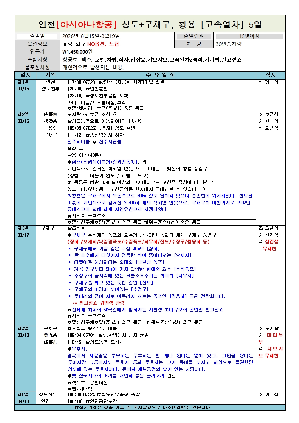 황금연휴 2026년 8월 15일~19일 중국 성도 구체구 @황용 ^고속 열차 4박 5일 안내 작성자풍산ㆍ소녀|작성시간09:06|조회수46 목록 댓글 6 글자크기 작게가 글자크기 크게가 ㆍ 다음검색 현재 게시글 추가 기능 열기 북마크 공유하기 신고 센터로 신고 댓글 댓글 6 댓글쓰기 답글쓰기 댓글 리스트 해당 댓글은 작성자와 운영진만 볼 수 있습니다. 작성자풍산ㆍ소녀 작성자 본인 여부 작성자 | 작성시간 14:30 new 2명 신청하셨습니다 해당 댓글은 작성자와 운영진만 볼 수 있습니다. 작성자풍산ㆍ소녀 작성자 본인 여부 작성자 | 작성시간 14:30 new 2명 신청하셨습니다 해당 댓글은 작성자와 운영진만 볼 수 있습니다. 댓글 전체보기