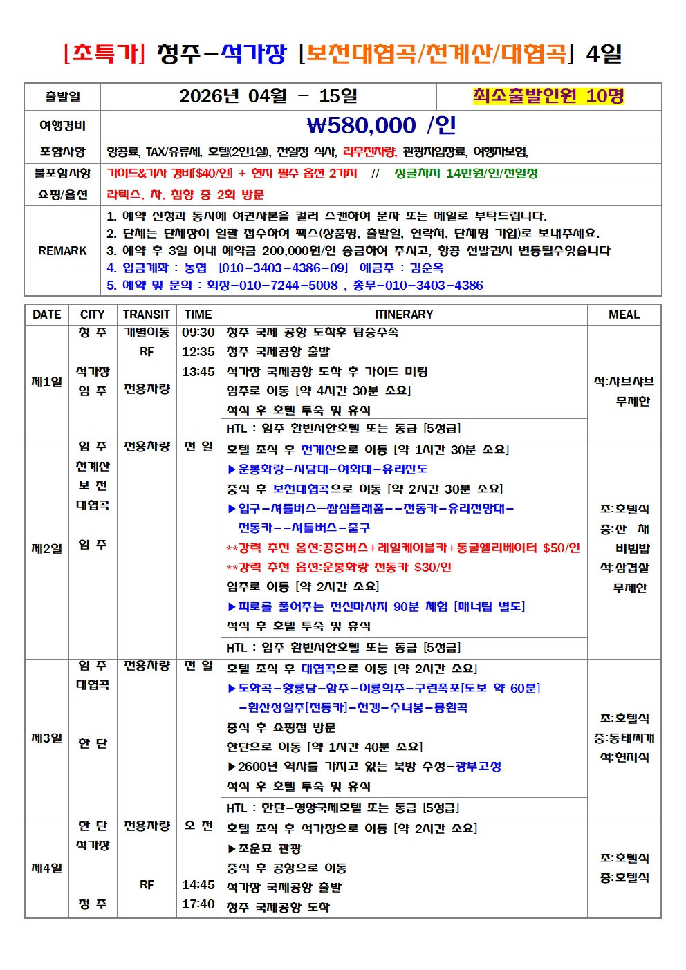 [초특가/청주출발580.000원]2026년 04월15일 태항산/천계산/보천대협곡/대항대협곡 3박4일 안내 작성자풍산ㆍ소녀|작성시간26.03.05|조회수618 목록 댓글 2 글자크기 작게가 글자크기 크게가 다음검색 현재 게시글 추가 기능 열기 북마크 공유하기 신고 센터로 신고 댓글 댓글 2 댓글쓰기 답글쓰기 댓글 리스트 작성자풍산ㆍ소녀 작성자 본인 여부 작성자 | 작성시간 26.03.08 3명 신청하셨습니다 해당 댓글은 작성자와 운영진만 볼 수 있습니다. 댓글 전체보기