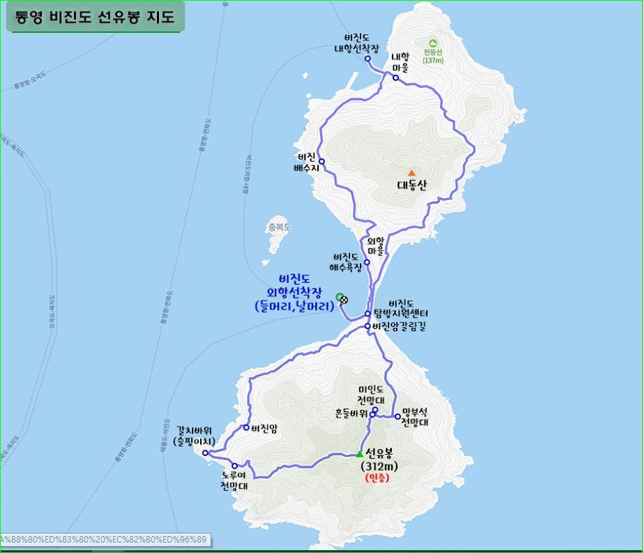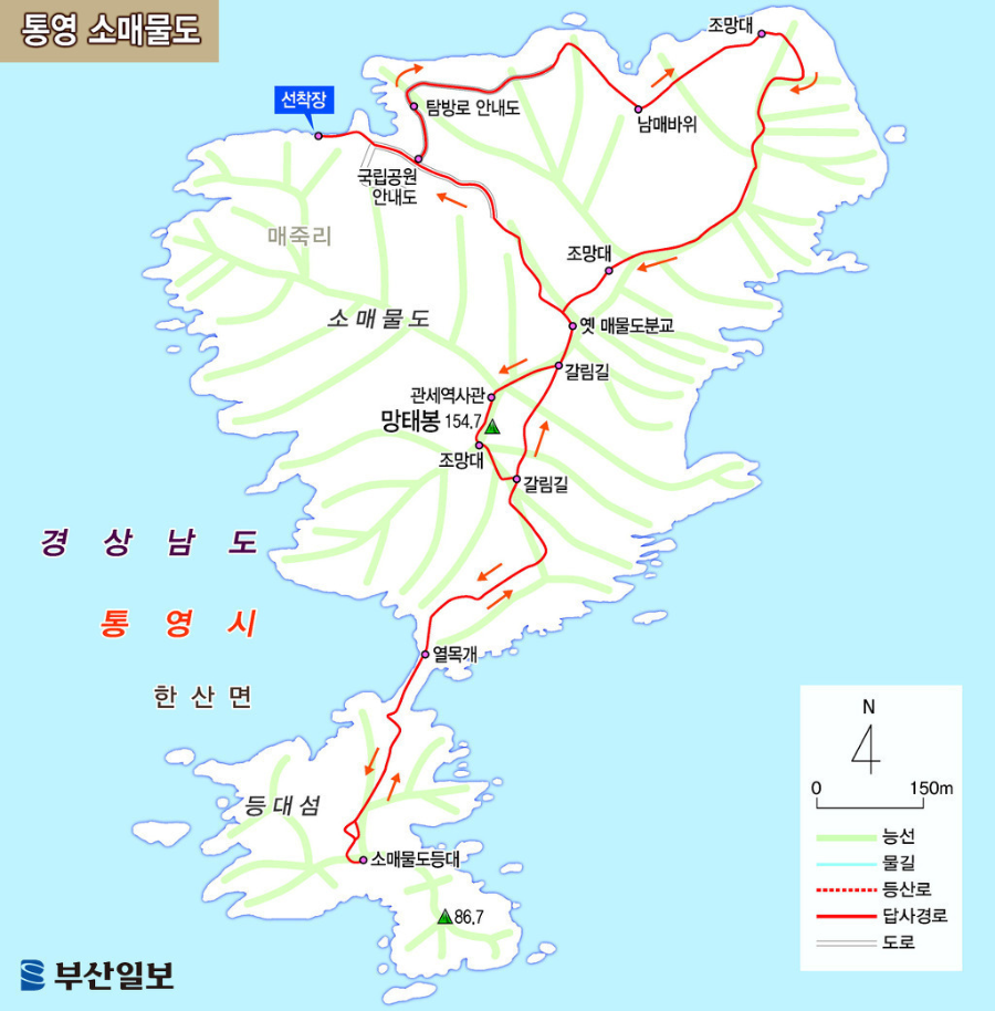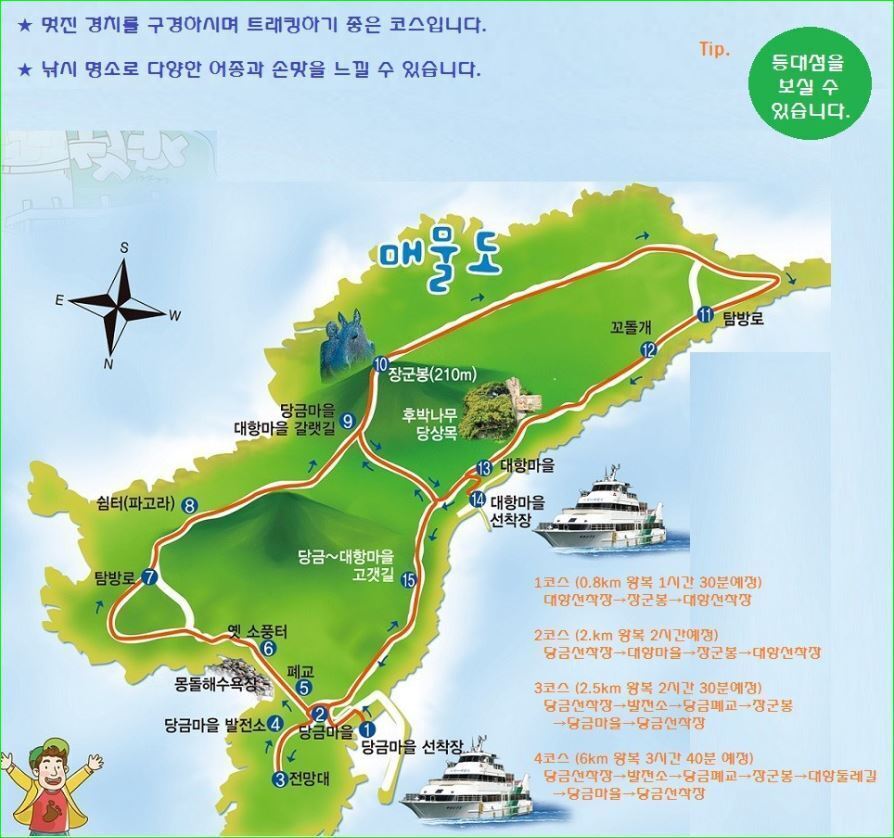 | 코스 | 1코스;대매물도':당금마을 선착장->전망대->쉼터->장군봉->꼬들개->대항마을->선착장{약4시간] 2코스: -소매물도 - 망태봉 ~등대섬 - 해금강 (약 2시간30분 트래킹 자유시간) |