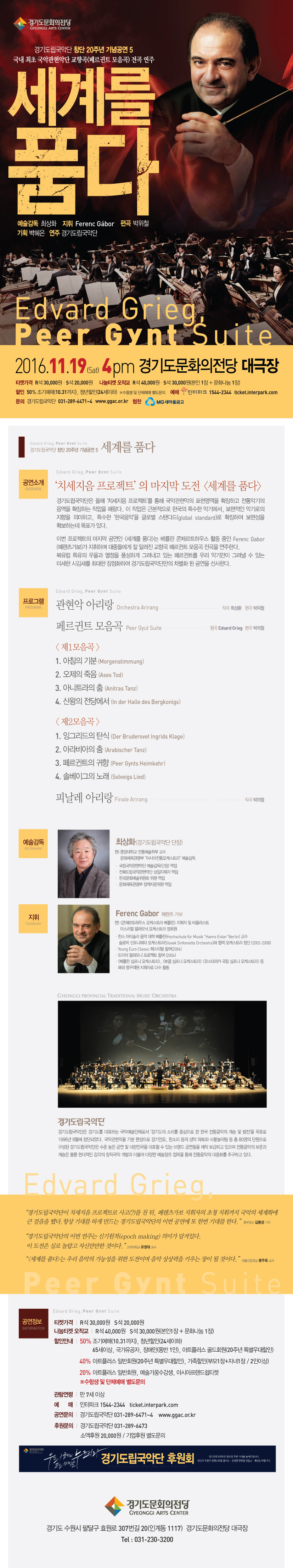 <솔베이지의 노래>는 페르귄트를 기다리는 솔베이지의 영원한 사랑을 노래한 것으로 애수를 띤 바이올린의 선율로 해서 많은 청중으로부터 사랑을 받고 있다. 경기도립국악단은 바이올린은 ‘해금’으로 표현한다.