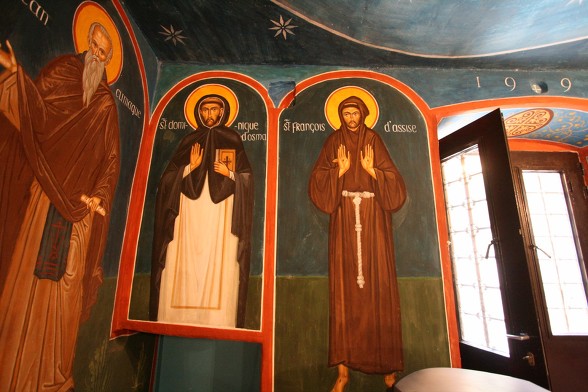 동방과 서방의 성인들 중간에 아씨시의 성 프란치스코와 도미니코 성인의 이콘이.