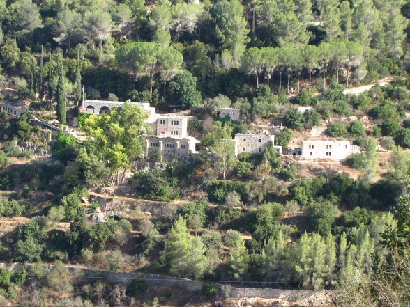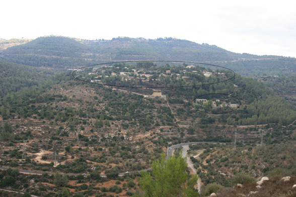 위쪽에 둥근 표시는 에벤 사피르 모샤브 마을이고 아래쪽 둥근 표시가 수도원이다. 수도원 아래쪽에 나 있는 도로가 있는 곳이 소렉 골짜기이다.