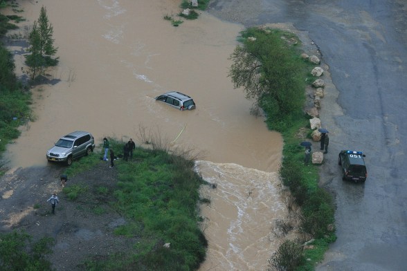 승용차가 빠져 떠내려가고...신기하지요...이렇게 물이 불어 흐리고 있는데 자동차를 몰고 거기를 건너려고 하는 이유가...차를 가지고 건너야 할 이유가 전혀 없는 곳인데 차를 몰고 들어가서 하루종일 사서 고생...
