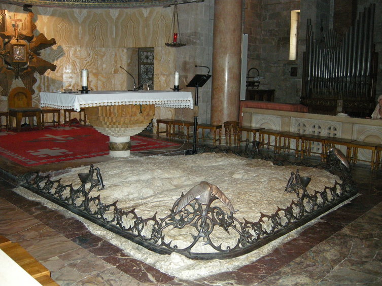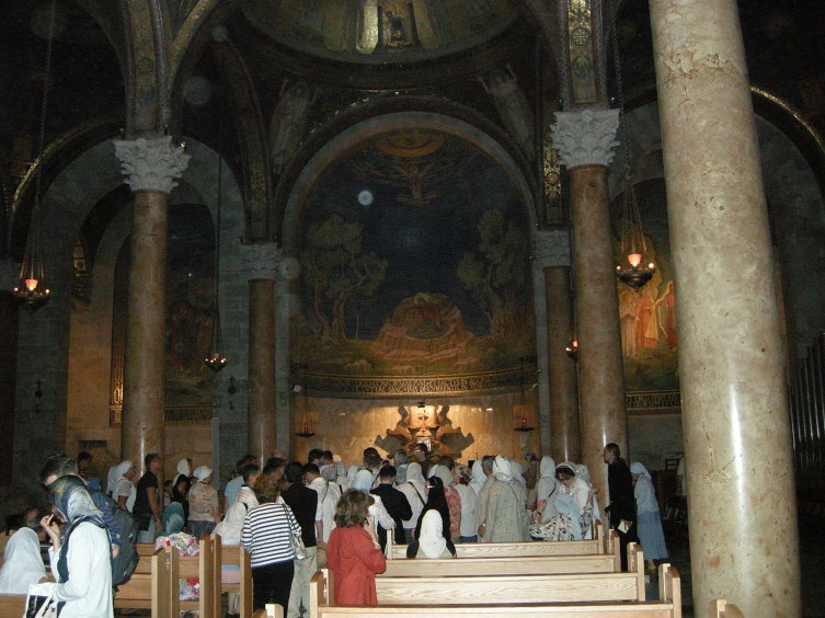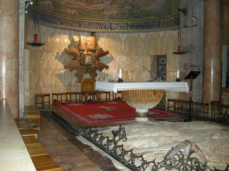 성당 내부제대 앞에는 예수께서 기도했다는 바위가 놓여져 있다. 비잔틴 시대의 모자이크 바닥의 일부분이 발견되었다. 새 모자이크는 원래의 것의 복사이다. 정면에는 네 명의 상이 각각 글귀가 새겨진 책을 들고 서 있다. 벽에는 예수의 고통과 세상의 고통을 하나님께 바치는 정교한 모자이크가 있다