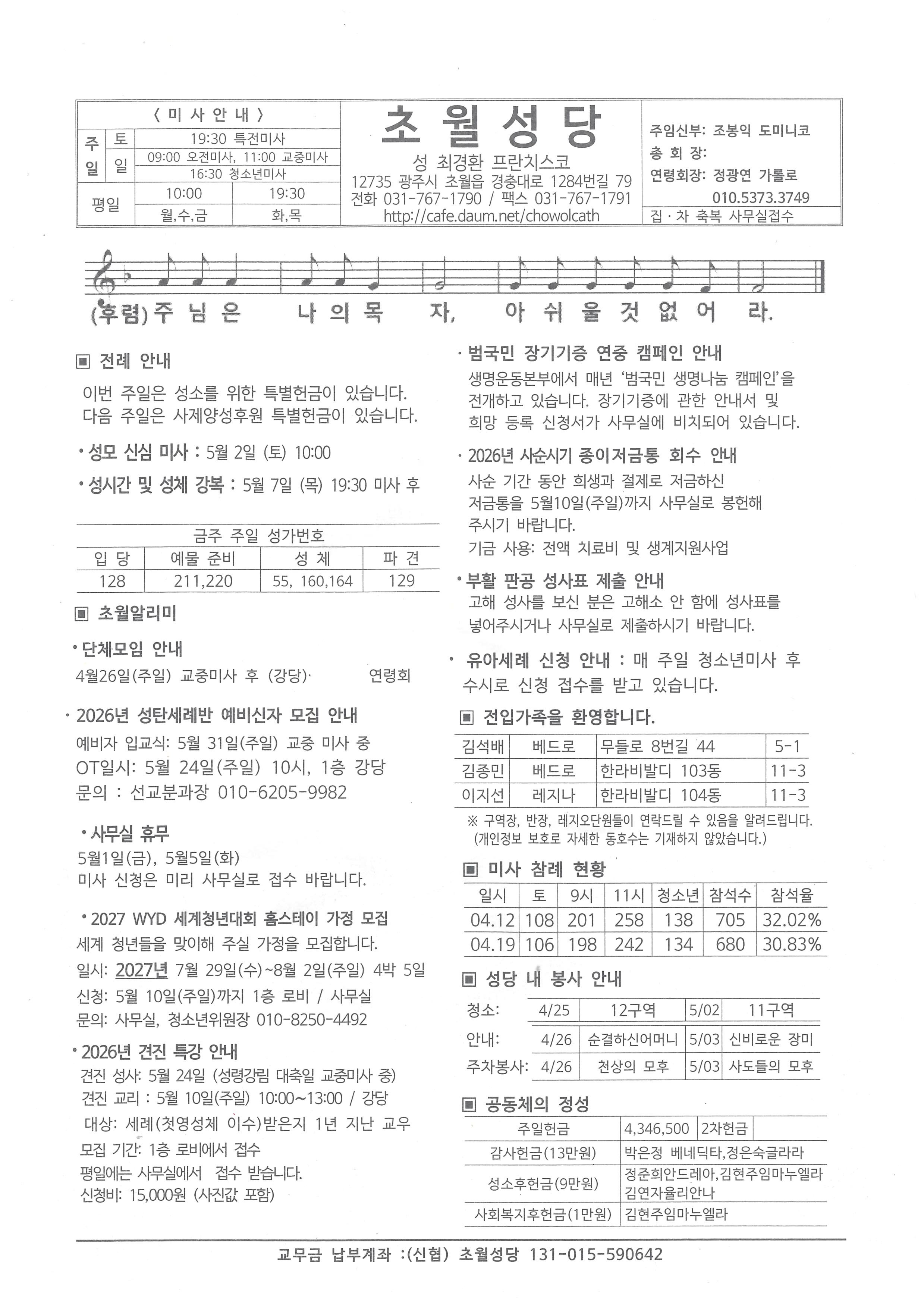 4월26일 주보 작성자안길환바오로(사무장)|작성시간26.04.25|조회수81 목록 댓글 0 글자크기 작게가 글자크기 크게가 다음검색 현재 게시글 추가 기능 열기 북마크 공유하기 신고 센터로 신고 댓글 댓글 0 댓글쓰기 답글쓰기 댓글 리스트
