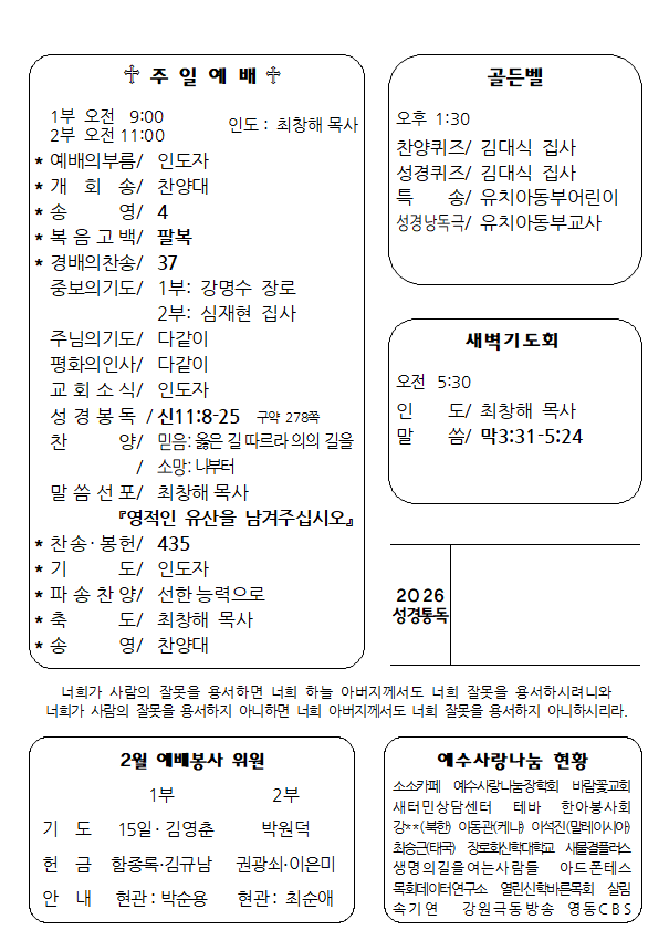2026년 2월 8일 주일 주보 작성자구본우|작성시간26.02.07|조회수25 목록 댓글 0 글자크기 작게가 글자크기 크게가 j260208001.png610.50KBj260208002.png45.93KBj260208003.png39.72KBj260208004.png127.91KB 첨부파일첨부된 파일이 8개 있습니다. png 파일 j260208002.png 다운로드 png 파일 j260208003.png 다운로드 png 파일 j260208004.png 다운로드 png 파일 j260208001.png 다운로드 png 파일 j260208002.png 다운로드 png 파일 j260208003.png 다운로드 png 파일 j260208001.png 다운로드 png 파일 j260208004.png 다운로드 다음검색 현재 게시글 추가 기능 열기 북마크 공유하기 신고 센터로 신고 댓글 댓글 0 댓글쓰기 답글쓰기 댓글 리스트