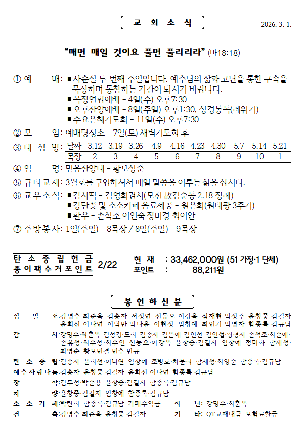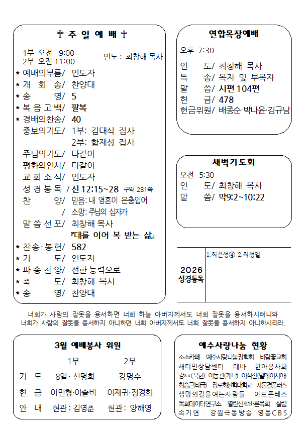 2026년 3월 1일 주일 주보 작성자구본우|작성시간26.02.28|조회수14 목록 댓글 0 글자크기 작게가 글자크기 크게가 20260301 (1).png609.43KB20260301 (2).png46.43KB20260301 (3).png47.67KB20260301 (4).png361.07KB 첨부파일첨부된 파일이 8개 있습니다. png 파일 20260301 (2).png 다운로드 png 파일 20260301 (3).png 다운로드 png 파일 20260301 (1).png 다운로드 png 파일 20260301 (4).png 다운로드 png 파일 20260301 (1).png 다운로드 png 파일 20260301 (2).png 다운로드 png 파일 20260301 (3).png 다운로드 png 파일 20260301 (4).png 다운로드 다음검색 현재 게시글 추가 기능 열기 북마크 공유하기 신고 센터로 신고 댓글 댓글 0 댓글쓰기 답글쓰기 댓글 리스트