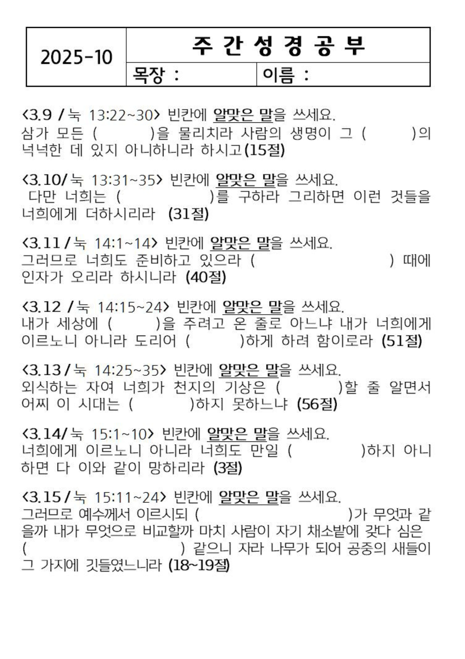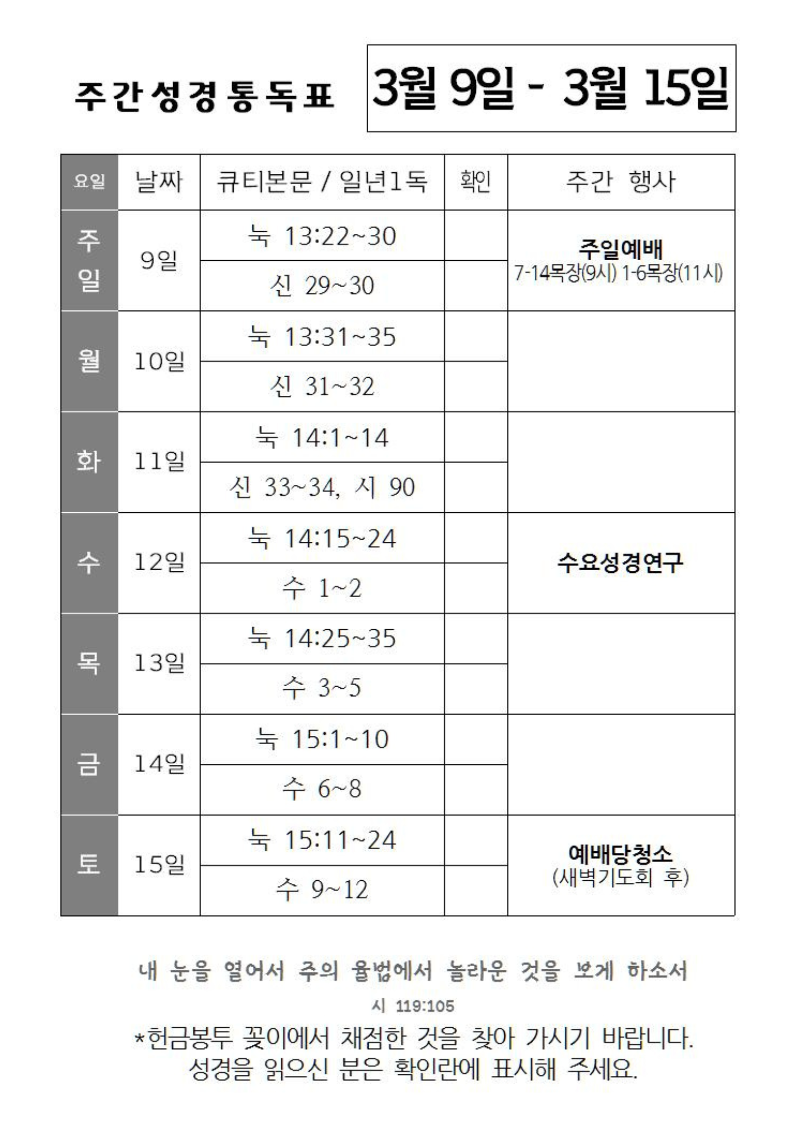 2025년 3월9일 주간성경공부 25-10 작성자구본우|작성시간25.03.08|조회수20 목록 댓글 0 글자크기 작게가 글자크기 크게가 주간성경공부(A5)20250309.png1.34MB주간성경통독표(A5)20250309.png1018.51KB 첨부파일첨부된 파일이 4개 있습니다. png 파일 주간성경통독표(A5)20250309.png 다운로드 png 파일 주간성경공부(A5)20250309.png 다운로드 png 파일 주간성경통독표(A5)20250309.png 다운로드 png 파일 주간성경공부(A5)20250309.png 다운로드 다음검색 현재 게시글 추가 기능 열기 북마크 공유하기 신고 센터로 신고 댓글 댓글 0 댓글쓰기 답글쓰기 댓글 리스트