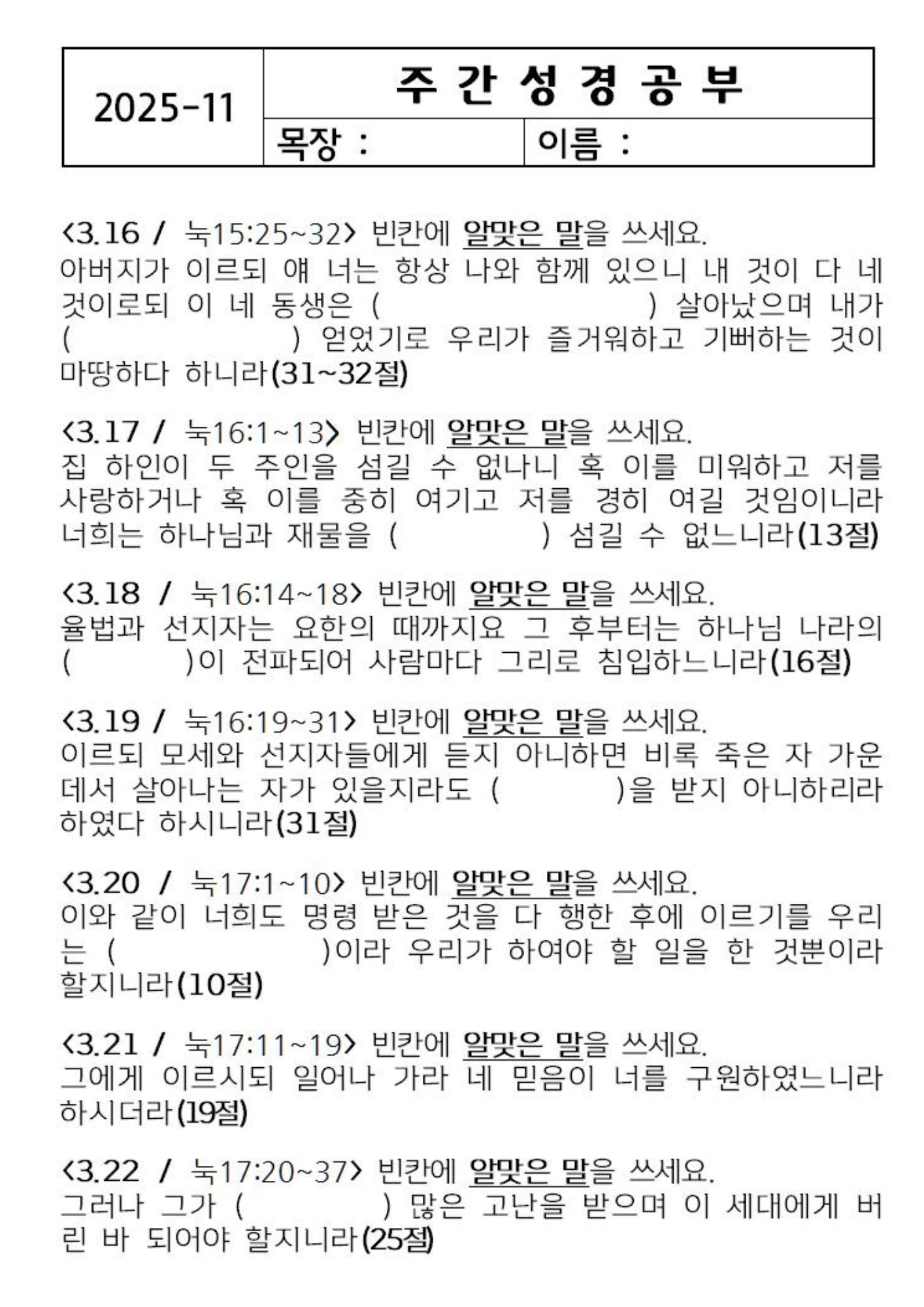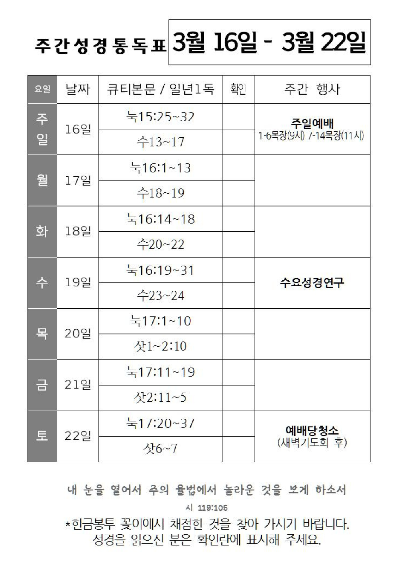 2025년 3월16일 주간성경공부 25-11 작성자구본우|작성시간25.03.15|조회수24 목록 댓글 0 글자크기 작게가 글자크기 크게가 주간성경공부(A5)20250316.png1.30MB주간성경통독표(A5)20250316.png879.65KB 첨부파일첨부된 파일이 4개 있습니다. png 파일 주간성경통독표(A5)20250316.png 다운로드 png 파일 주간성경공부(A5)20250316.png 다운로드 png 파일 주간성경공부(A5)20250316.png 다운로드 png 파일 주간성경통독표(A5)20250316.png 다운로드 다음검색 현재 게시글 추가 기능 열기 북마크 공유하기 신고 센터로 신고 댓글 댓글 0 댓글쓰기 답글쓰기 댓글 리스트
