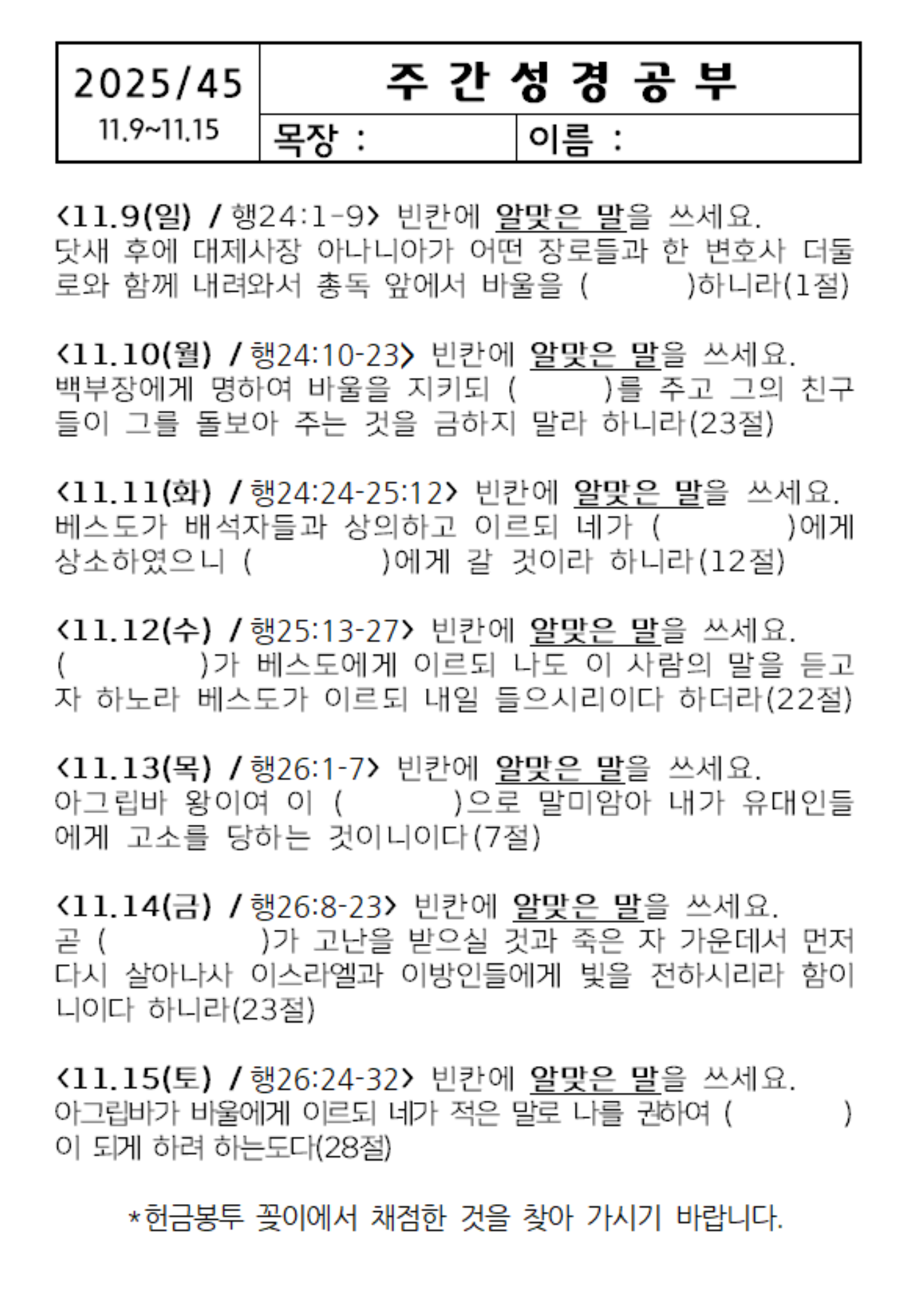 2025년 11월8일 주간성경공부 25-45 작성자구본우|작성시간25.11.07|조회수1 목록 댓글 0 글자크기 작게가 글자크기 크게가 주간성경공부20251109.png658.79KB 첨부파일첨부된 파일이 2개 있습니다. png 파일 주간성경공부20251109.png 다운로드 png 파일 주간성경공부20251109.png 다운로드 다음검색 현재 게시글 추가 기능 열기 북마크 공유하기 신고 센터로 신고 댓글 댓글 0 댓글쓰기 답글쓰기 댓글 리스트