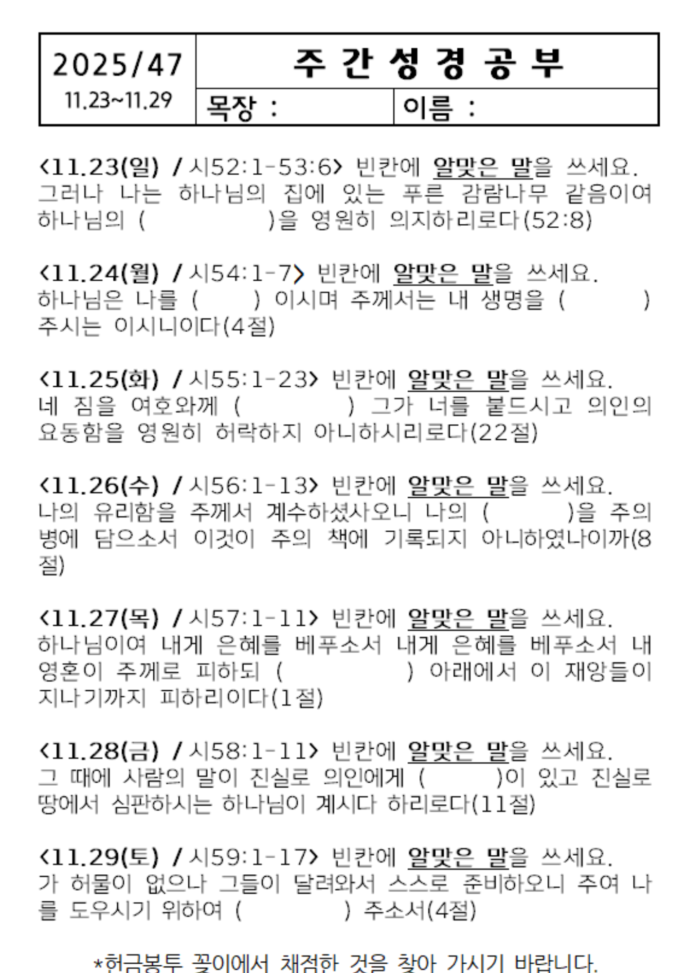 2025년 11월23일 주간성경공부 25-47 작성자구본우|작성시간25.11.22|조회수0 목록 댓글 0 글자크기 작게가 글자크기 크게가 주간성경공부20251123.png652.55KB 첨부파일첨부된 파일이 2개 있습니다. png 파일 주간성경공부20251123.png 다운로드 png 파일 주간성경공부20251123.png 다운로드 다음검색 현재 게시글 추가 기능 열기 북마크 공유하기 신고 센터로 신고 댓글 댓글 0 댓글쓰기 답글쓰기 댓글 리스트