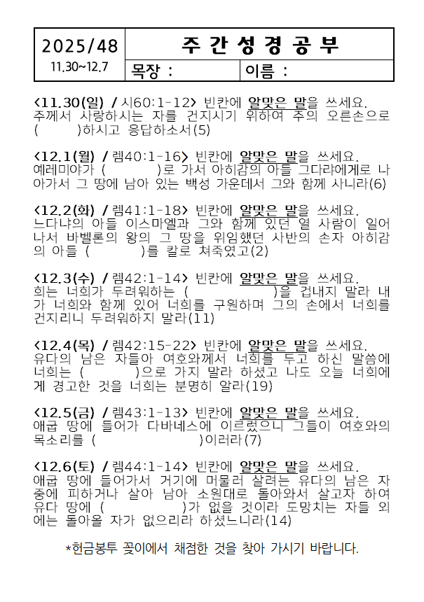 2025년 11월30일 주간성경공부 25-48 작성자구본우|작성시간25.11.29|조회수0 목록 댓글 0 글자크기 작게가 글자크기 크게가 주간-성경공부47(20251130).png65.58KB 첨부파일첨부된 파일이 2개 있습니다. png 파일 주간-성경공부47(20251130).png 다운로드 png 파일 주간-성경공부47(20251130).png 다운로드 다음검색 현재 게시글 추가 기능 열기 북마크 공유하기 신고 센터로 신고 댓글 댓글 0 댓글쓰기 답글쓰기 댓글 리스트