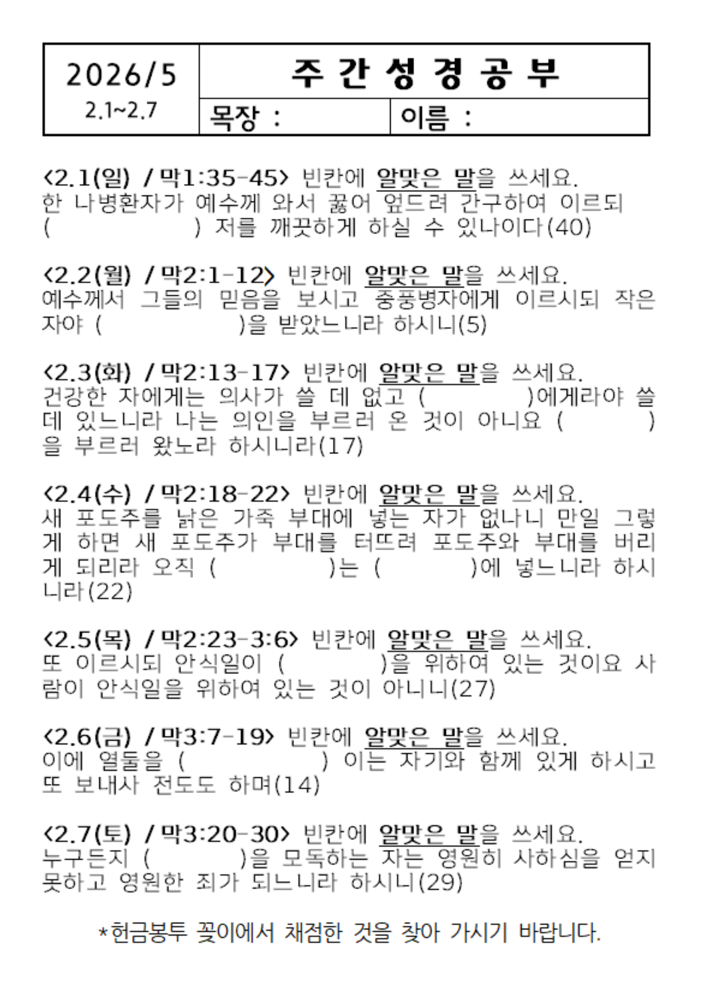 2026년 2월1일 주간성경공부 26-5 작성자구본우|작성시간26.01.31|조회수8 목록 댓글 0 글자크기 작게가 글자크기 크게가 주간성경공부5.png634.75KB 첨부파일첨부된 파일이 2개 있습니다. png 파일 주간성경공부5.png 다운로드 png 파일 주간성경공부5.png 다운로드 다음검색 현재 게시글 추가 기능 열기 북마크 공유하기 신고 센터로 신고 댓글 댓글 0 댓글쓰기 답글쓰기 댓글 리스트