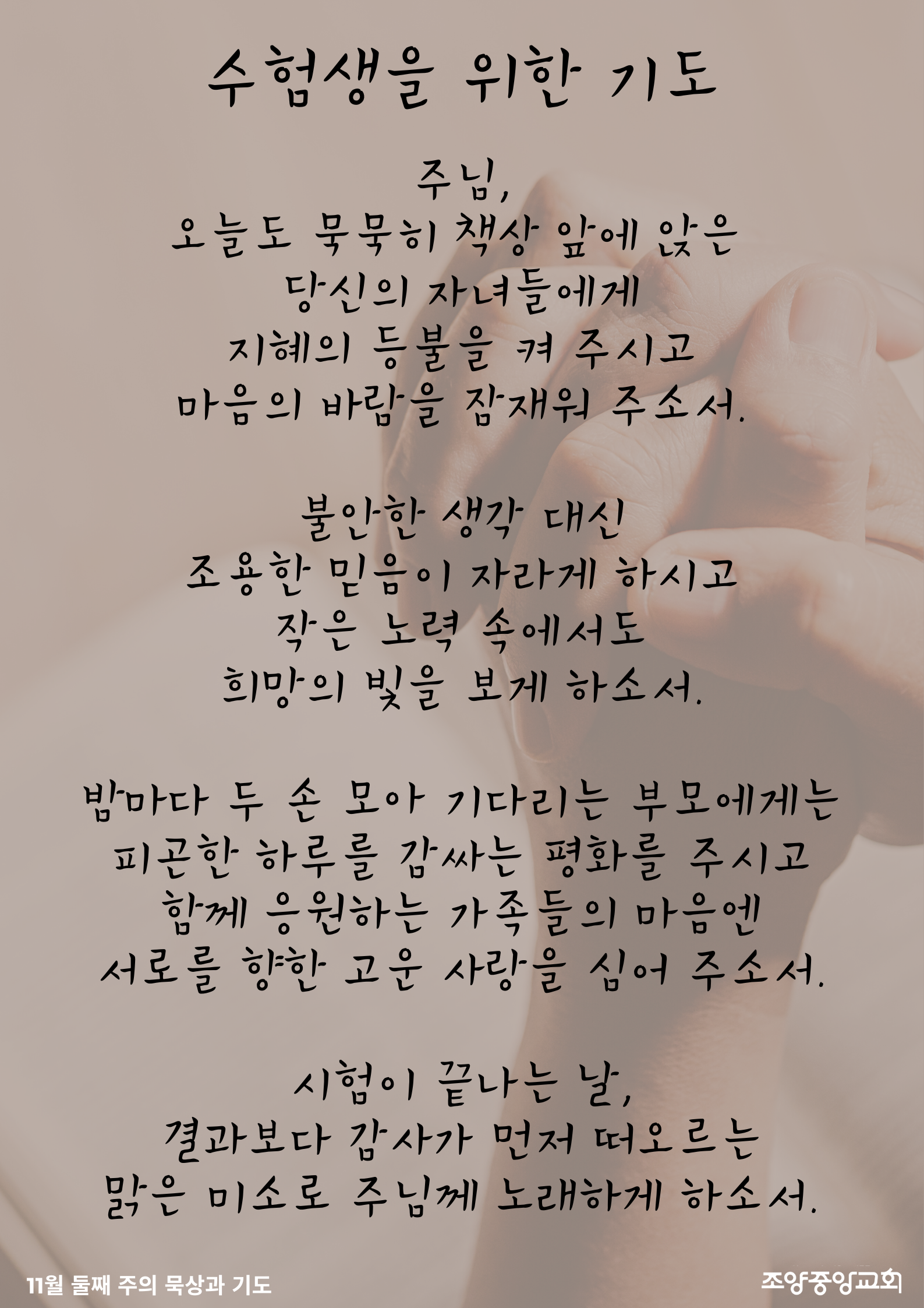 2025년 11월 9일 "수험생을 위한 기도" 작성자구본우|작성시간25.11.07|조회수12 목록 댓글 0 글자크기 작게가 글자크기 크게가 금주의기도.png2.09MB 첨부파일첨부된 파일이 2개 있습니다. png 파일 금주의기도.png 다운로드 png 파일 금주의기도.png 다운로드 다음검색 현재 게시글 추가 기능 열기 북마크 공유하기 신고 센터로 신고 댓글 댓글 0 댓글쓰기 답글쓰기 댓글 리스트