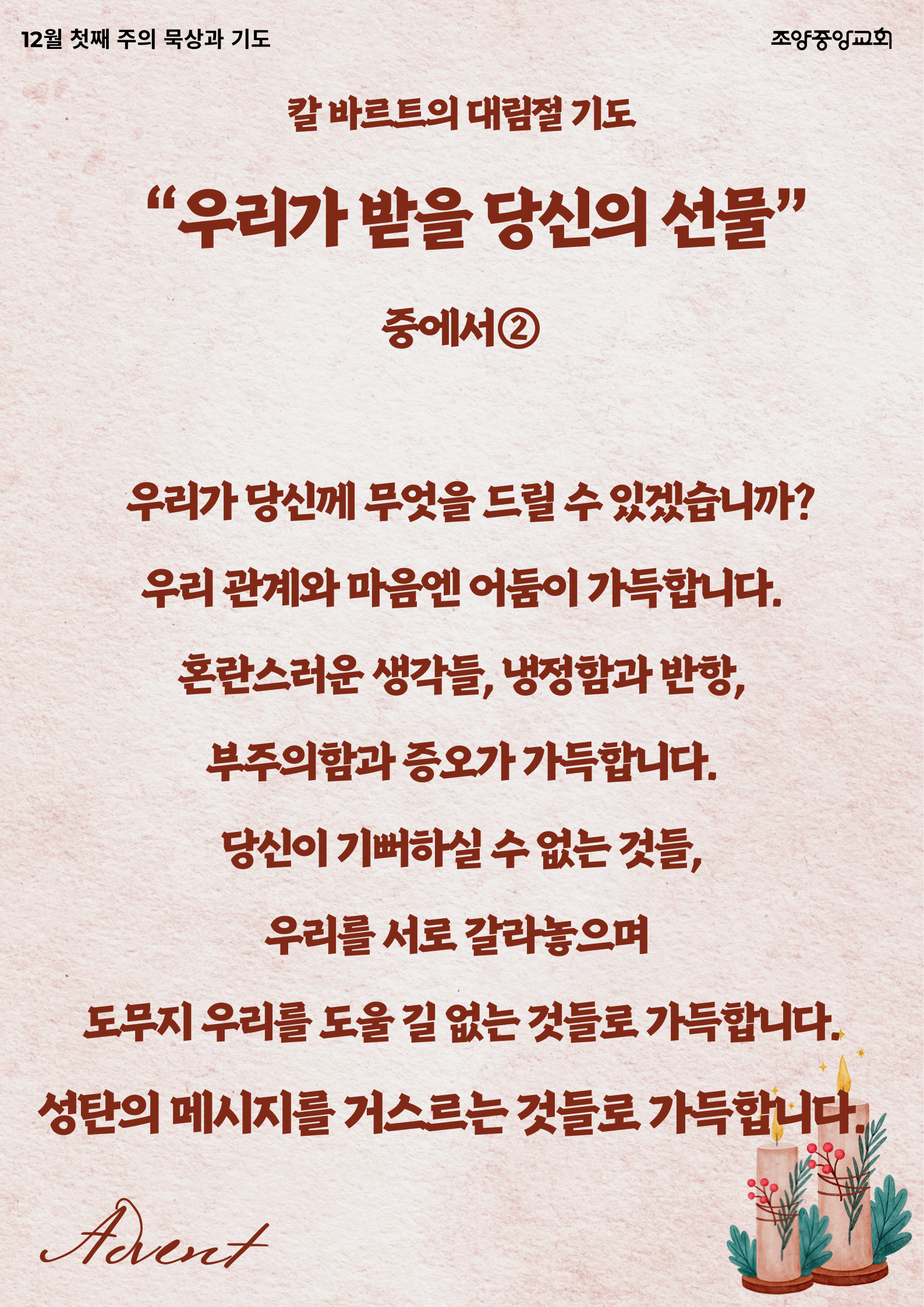 2025년 12월 7일 "우리가 받을 당신의 선물" #2 작성자구본우|작성시간25.12.06|조회수6 목록 댓글 0 글자크기 작게가 글자크기 크게가 2025대림절기도 (2).png4.06MB 첨부파일첨부된 파일이 2개 있습니다. png 파일 2025대림절기도 (2).png 다운로드 png 파일 2025대림절기도 (2).png 다운로드 다음검색 현재 게시글 추가 기능 열기 북마크 공유하기 신고 센터로 신고 댓글 댓글 0 댓글쓰기 답글쓰기 댓글 리스트
