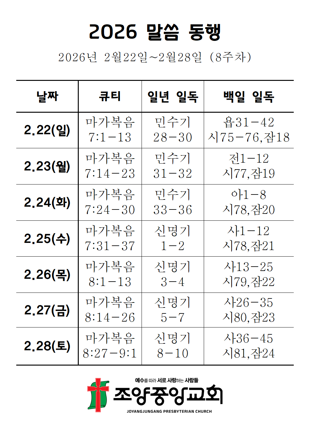 2026년 2월 넷째주 (8주차) 작성자구본우|작성시간26.02.21|조회수5 목록 댓글 0 글자크기 작게가 글자크기 크게가 말씀동행8.png97.93KB 첨부파일첨부된 파일이 2개 있습니다. png 파일 말씀동행8.png 다운로드 png 파일 말씀동행8.png 다운로드 다음검색 현재 게시글 추가 기능 열기 북마크 공유하기 신고 센터로 신고 댓글 댓글 0 댓글쓰기 답글쓰기 댓글 리스트