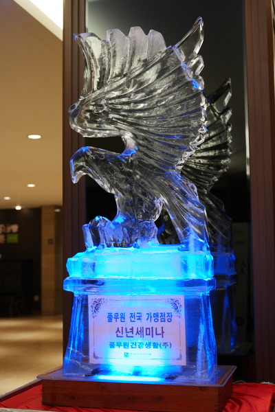 '풀무원 전국 가맹점장 신년세미나'를 위해 제작된 입구에 세워진 독수리 얼음동상입니다.