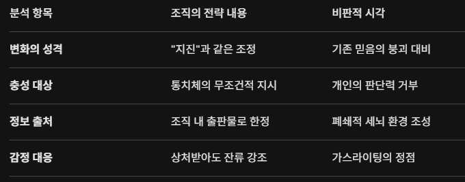 2. 무조건적인 충성 강요: "상식적으로 이해되지 않더라도 통치체의 결정에 충성하라"고 강조합니다. 예수의 제자들이 이해하기 힘든 가르침에도 남았던 사례를 들며, 비판적 사고를 원천 봉쇄하고 있죠.