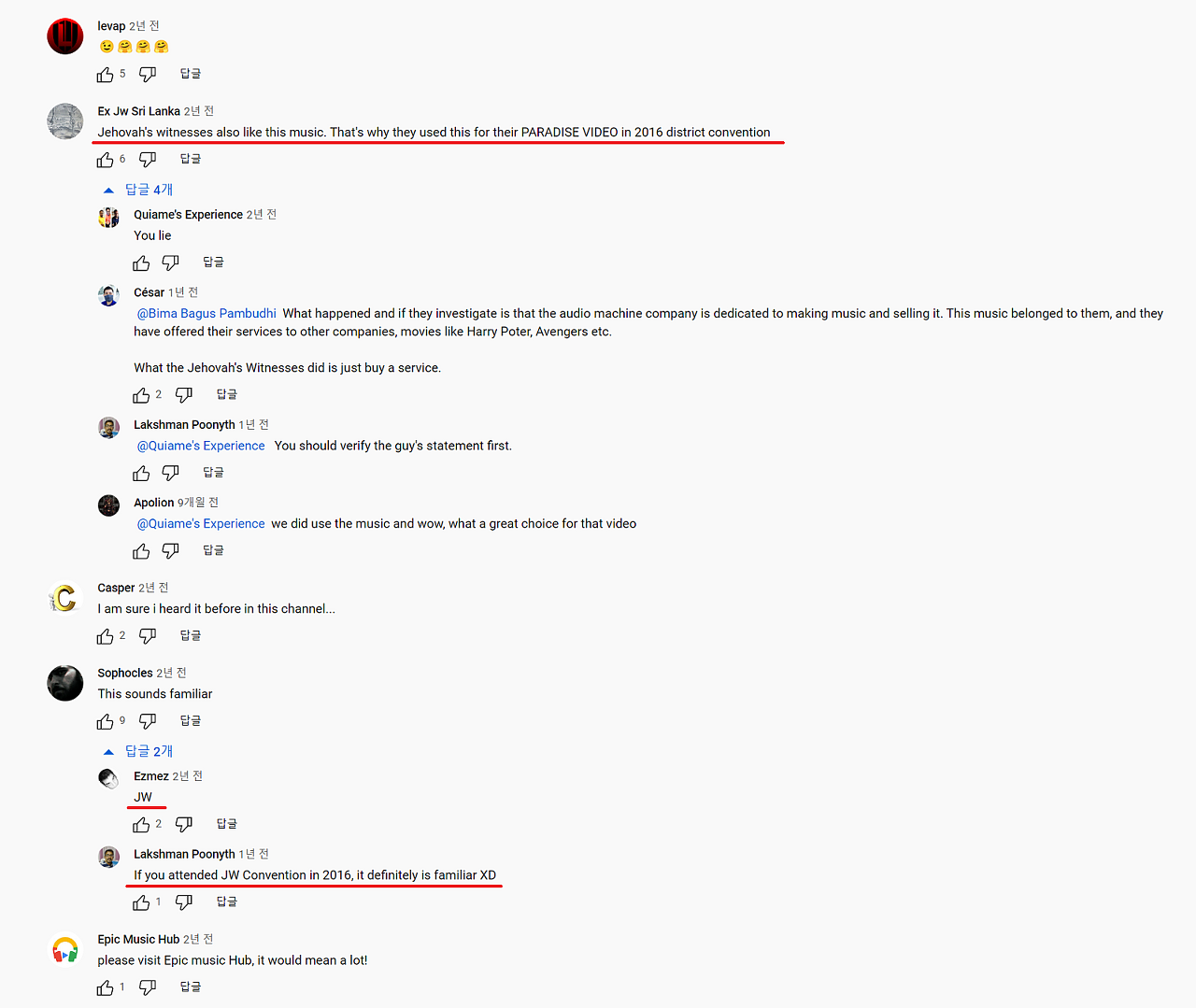 만약 그 형제나 자매가 모르고 그렇게 한 것이라면 사탄이 속으로 얼마나 웃었을까 하는 생각이 듭니다. 일부러 그렇게 했다면 말할 것도 없지요. 물론 그게 뭐 그렇게 충격적인 일인가 하고 생각되실 수도 있지만, 음악에는 아주 강력한 힘이 있으며 충실하고 슬기로운 종은 세상이 만들어내는 음악에 대해 꾸준히 경고해 왔다는 것을 잘 아실 것입니다. 그리고 저처럼 음악을 좋아하고 감각이 좀 예민한 형제 자매들에게는 분명 충격적인 일입니다. 2016년 지역 대회 당시 대회장에서 그 엔딩 동영상을 보면서 너무나 큰 감동을 받고 눈물을 흘렸던 기억이 생생한데, 이제는 앞으로 그 동영상을 못 볼 것 같습니다. 정확한 사실을 조사해서 알맞은 조처를 취해 주시기를 바랍니다. 이 편지를 번역해서 본부에 보내고 답을 얻는 데 시간과 노력이 많이 드시겠지만, 저에게도 꼭 답을 알려 주시기를 부탁드립니다.