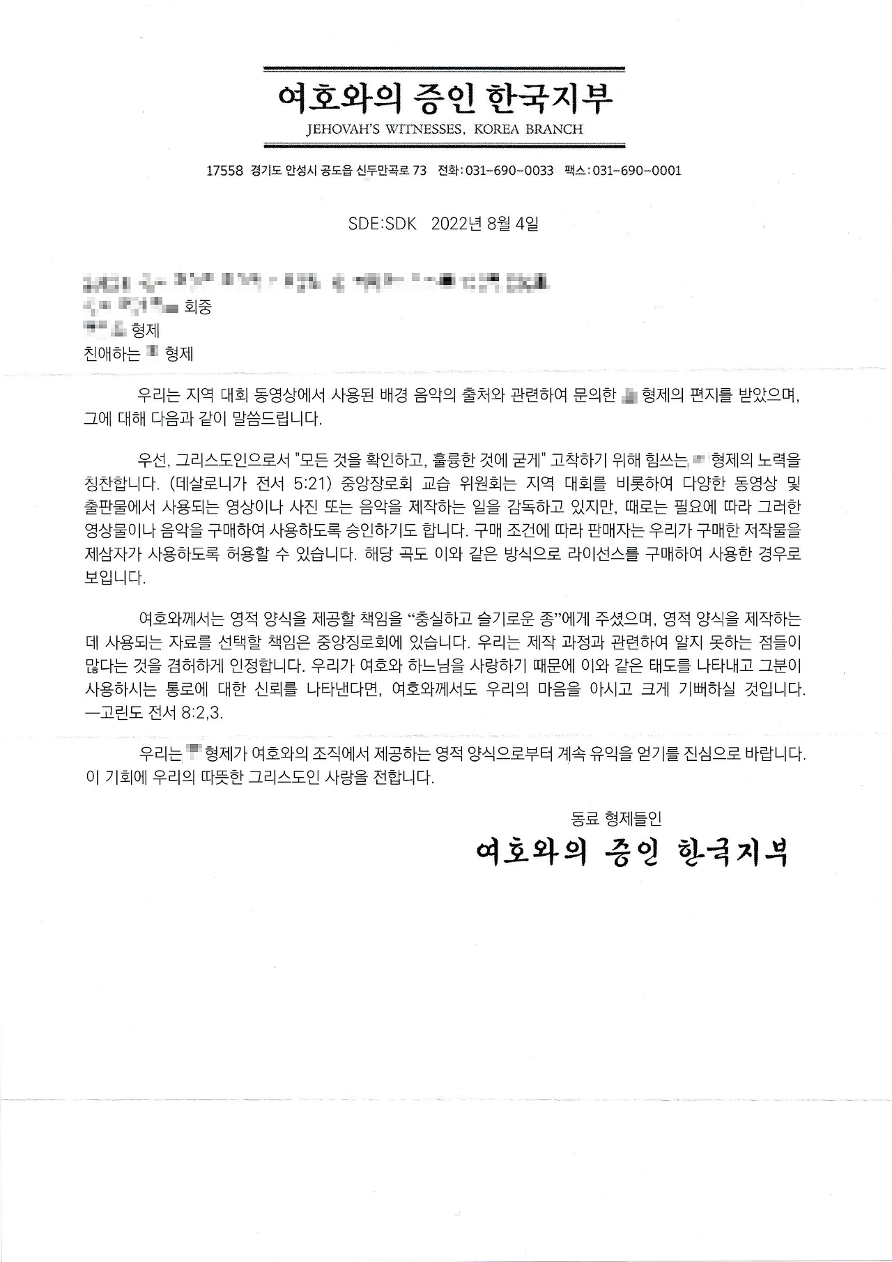 안녕하십니까? OO회중의 TakeBackControl 형제입니다. 덥고 습한 여름에 주의 일에 수고가 많으십니다. 다름이 아니라 대회 동영상의 배경 음악과 관련해서 문의드리고자 편지를 보냅니다.