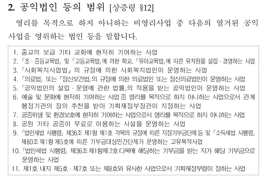 공익법인 : 상속세 및 증여세법 시행령 제12조 각호에 열거된 공익법인을 말하며 불특정 다수의 이익(공익)을 사업목적으로 하는 법인을 말합니다.