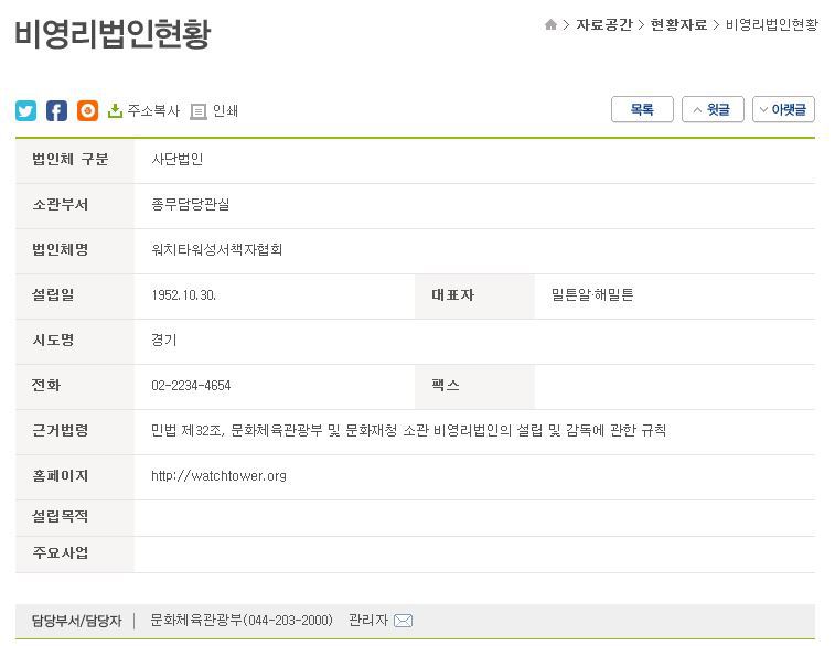 워치타워성서협회는 사단법인 설립 근거법상 문화체육관광부 관할이며 위 8조의 불가피한 경우에 해당하는 경우는 본인들의 설립 취지 및 정관에서 명시되다 싶이 국가기관 조사에 응해야 합니다. 거절을 하는 즉시 법인설립을 부정하는 입장이 되어버리기 때문입니다. 단 법이라는게 코에 걸면 코걸이, 귀에 걸면 귀걸이가 되듯이 위의 ‘불가피한 경우’에 대한 명확한 법적 가이드라인이 없습니다(제가 못찾는건지…)