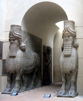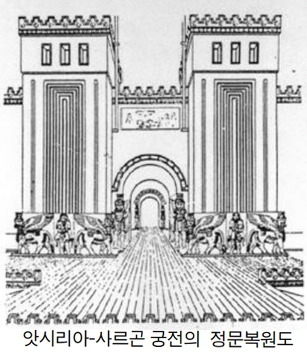 입구에는 사람 머리에 날개가 달린 거대한 수소상(라마수:lamassu)이 문을 지키고 있었는데, 그중 한 쌍은 높이가 5m나 되었습니다. 궁전