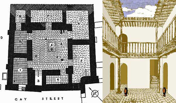 진입이 이루어지고 중정의 중앙에는 하수구가 설치되어 있습니다. 1층에는 주로 공적인 기능을 지닌 공간이 배치되었으며 2층에는 사적인