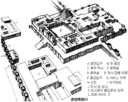 7.5m 높이로 성토를 하고 면적이 거의 10헥타르에 이르는 대지(臺地) 위에 방이 200개나 있는 왕궁을 세웠습니다.