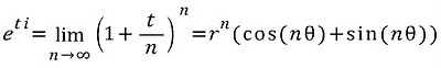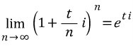 t는 어느 복소수나 될 수 있지만 증명의 편의를 위해 여기에서는 t를 실수로 가정하겠습니다. 그렇다면 거듭제곱 안에 있는 수는 실수부가 1이고 허수부가 t/n인 복소수가 됩니다. 복소수 複素數 Complex Number의 2.2.2 곱셈을 참고하시면 모든 복소수는 극좌표를 이용한 표현으로 나타낼 수 있고, 그것을 거듭제곱으로 확장하면 다음과 같다는 것을 쉽게 알 수 있을 것입니다.