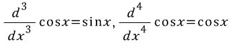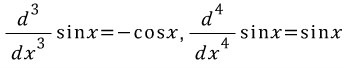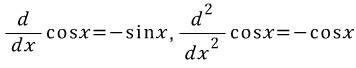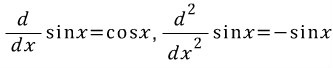 사인함수는 미분하면 코사인함수가 됩니다. 코사인함수는 미분하면 -사인함수가 되고, 다시 이것을 미분하면 -코사인, 또 다시 이것을 미분하면 처음 형태인 사인함수가 되어 주기를 이루게 됩니다. 이것을 수식으로 표현하면,