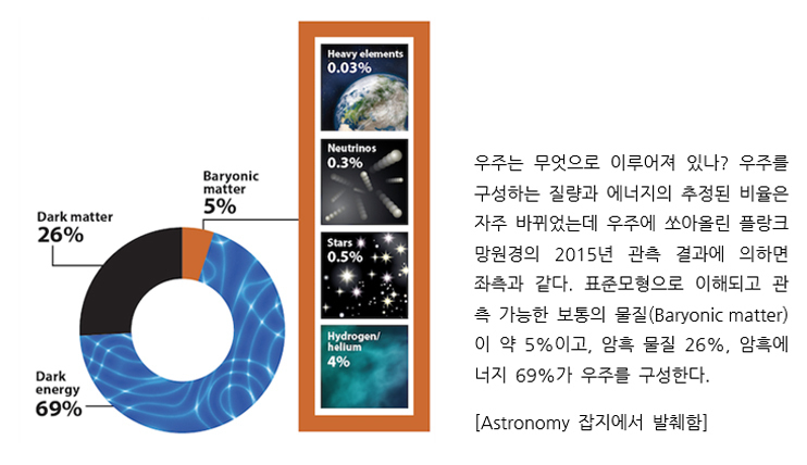 또 한편, 표준모형의 기본 입자로 설명할 수 있는 우주의 물질은 전체에서 고작 5%밖에 되지 않는다. 천문학에서 얻은 큰 성과 중 하나가 암흑 물질의 존재를 밝힌 것이다. 그리고 우주의 팽창 속도에 깊이 관여하는 암흑 에너지 발견도 있었다. 하지만 모든 물질을 설명해줄 수 있으리라 예상되었던 표준모형은 암흑 물질과 암흑 에너지를 설명하지 못한다.4) 뒤에서 논의하겠지만 암흑 에너지와 우주의 진공 에너지를 연결하는 시도는 둘 사이의 엄청난 차이로 실패했다. 그러므로 이것들을 설명하기 위해서는 아예 새로운 이론이 필요하다. 그 이론은 표준모형을 포함하는 더 큰 이론이 되어야겠지만 아직 오리무중이다. 표준모형에서 암흑 물질로 간주할 수 있는 입자는 중성미자밖에 없는데, 중성미자는 전체 암흑 물질의 소량만을 차지한다.