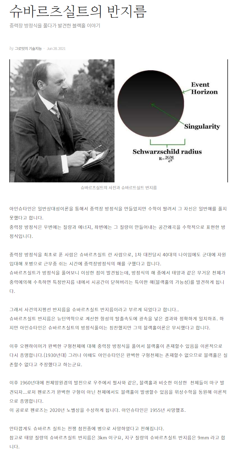 슈바르츠실트 반지름과 블랙홀 작성자뽀야|작성시간22.05.19|조회수336 목록 댓글 0 글자크기 작게가 글자크기 크게가 다음검색 현재 게시글 추가 기능 열기 북마크 공유하기 신고 센터로 신고 댓글 댓글 0 댓글쓰기 답글쓰기 댓글 리스트