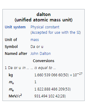 Dalton (unit) atomic mass 작성자뽀야|작성시간22.05.29|조회수487 목록 댓글 0 글자크기 작게가 글자크기 크게가 kg mu me MeV/c2 1.66053906660(50)×10−27 1 1822.888486209(53) 931.49410242(28) 다음검색 현재 게시글 추가 기능 열기 북마크 공유하기 신고 센터로 신고 댓글 댓글 0 댓글쓰기 답글쓰기 댓글 리스트