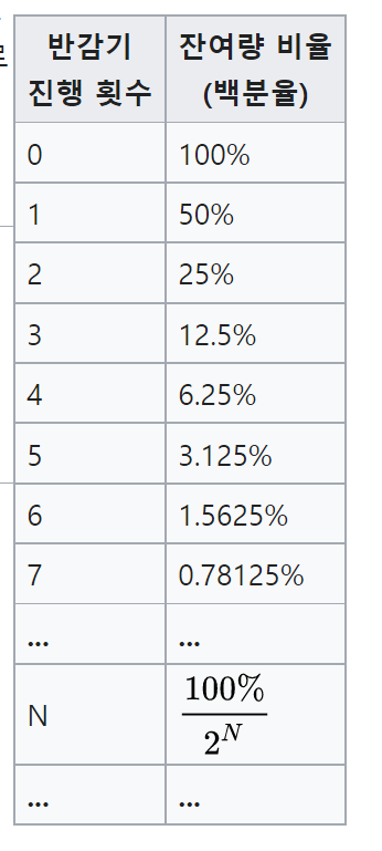 반감기(t1⁄2)는 어떠한 물질의 양이 초기값의 절반이 되는데 걸리는 시간이다. 이 용어는 불안정한 원자들이 얼마나 빠른 속도로 핵분열을 하는지를 설명하기 위하여 핵물리학에서 빈번히 사용되지만, 임의의 지수함수적 붕괴를 논하는데 더 일반적으로 사용된다. 오른쪽의 표로 반감기가 몇번 경과했는가에 따라 '어떤 양'이 어떻게 감소하는지 알 수 있다.