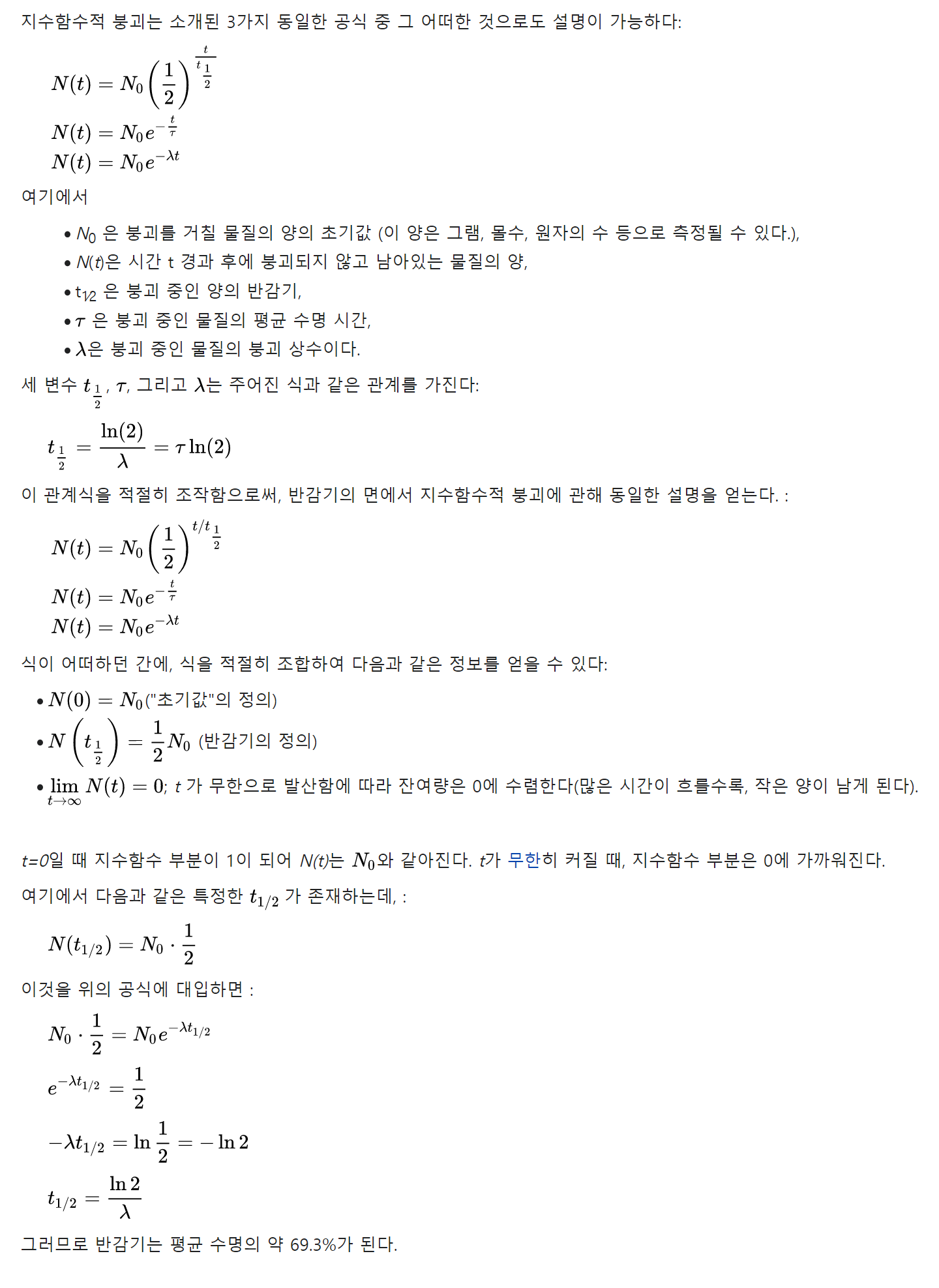 지수함수적 붕괴의 반감기에 대한 식