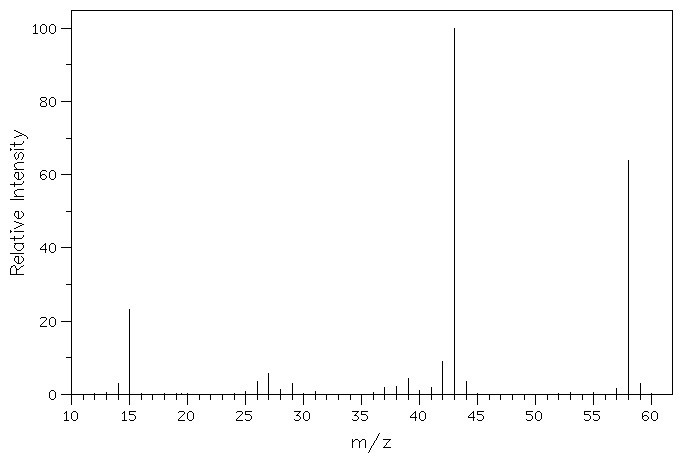 [그림] mass of acetone (FW 58.08 g/mol). 분자 이온 피크 = 58.