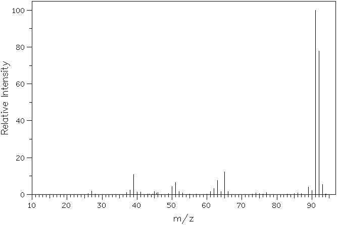 톨루엔(Toluene, 분자량 = 92 g/mol)의 질량 스펙트럼(mass spectrum).