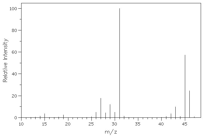 [그림] mass of ethyl alcohol (FW 46.07 g/mol). 분자 이온 피크 = 46.