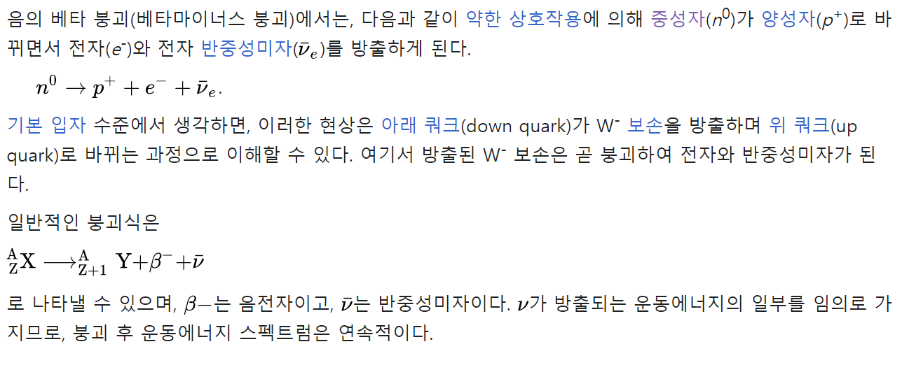 1911년에 리제 마이트너와 오토 한은 베타 붕괴에서 발생하는 전자 에너지의 스펙트럼이 선 스펙트럼이 아닌 연속적인 스펙트럼이 됨을 실험으로 보였다.