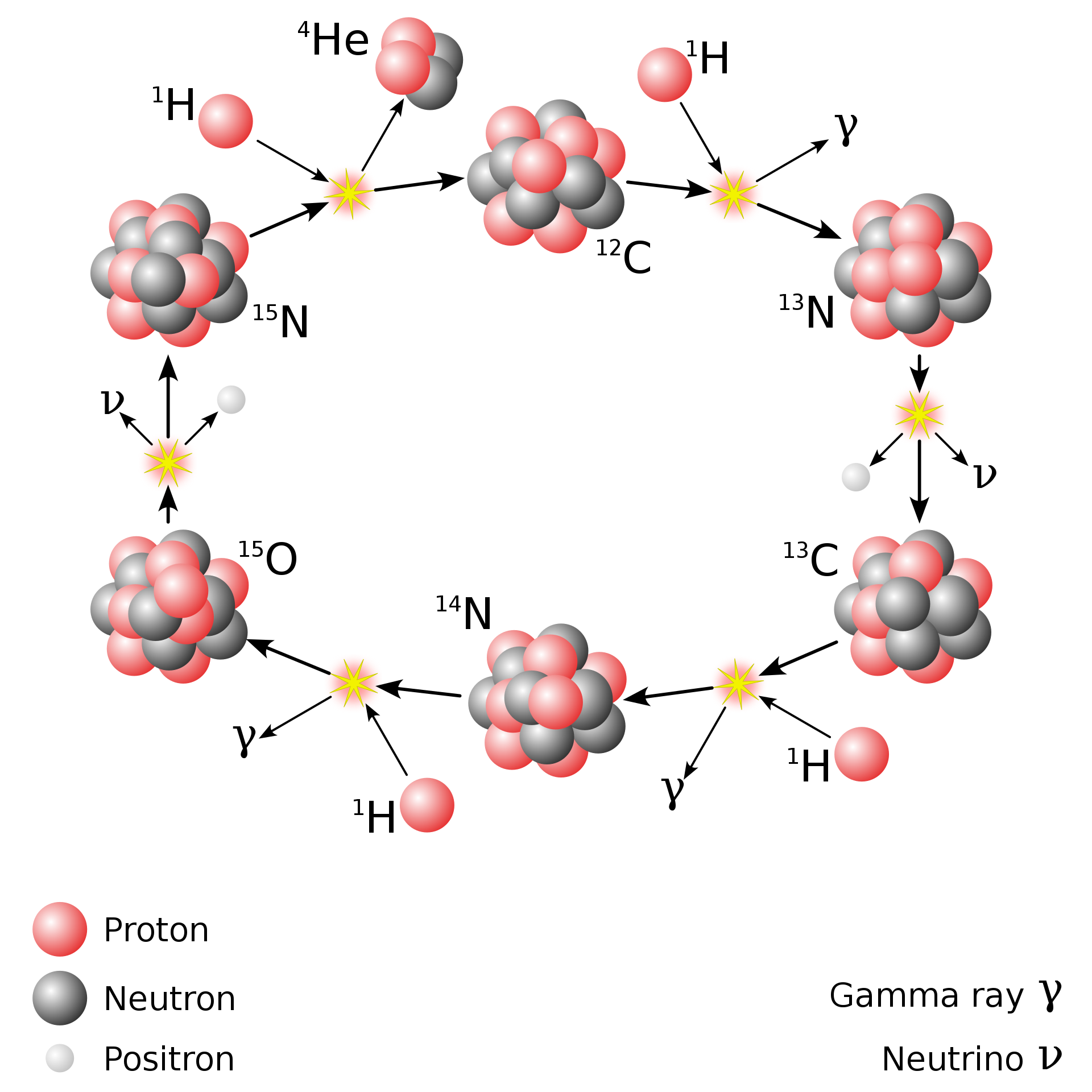 이 두 결합 에너지의 차이만큼이 양성자를 중성자, 양전자, 중성미자로 변환하는 데에 쓰이고, 그리고도 남는 에너지는 생성물의 운동 에너지로 전환된다.
